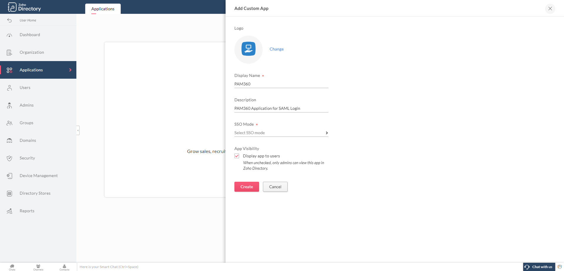 - 次に、[作成]をクリックして、PAM360 を Zoho Directory内のアプリケーションとして作成します。