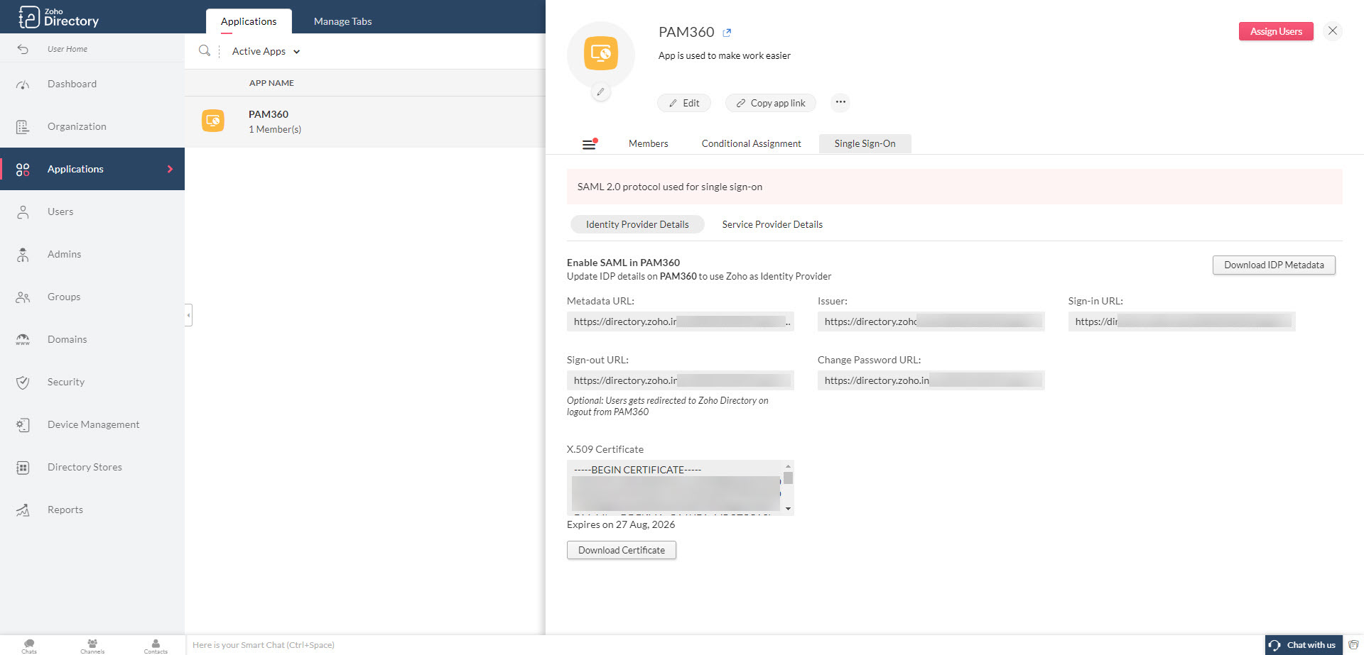 - Zoho Directoryの PAM360 アプリケーション ページに移動します。