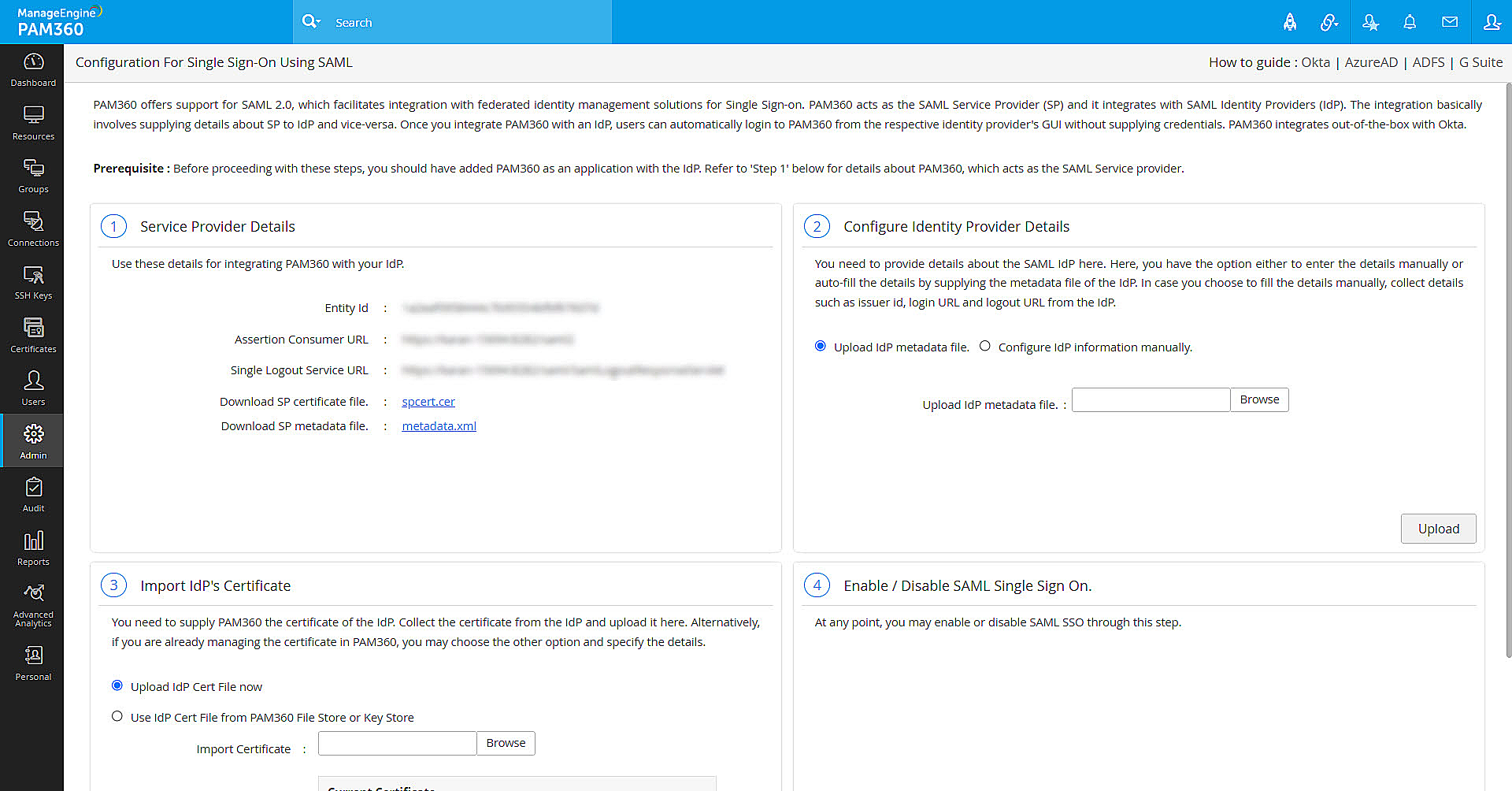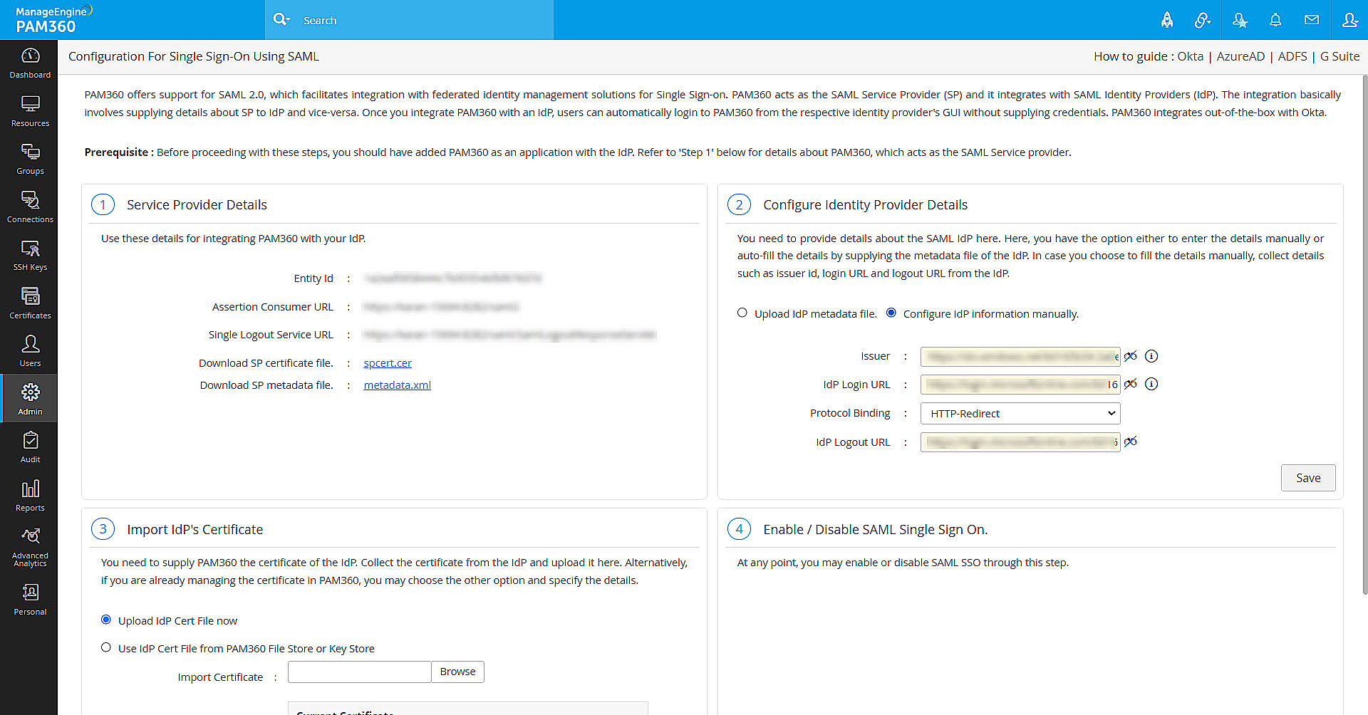- PAM360 インターフェースに戻り、[管理]>>[認証]>>[SAML シングル サインオン]に移動します。