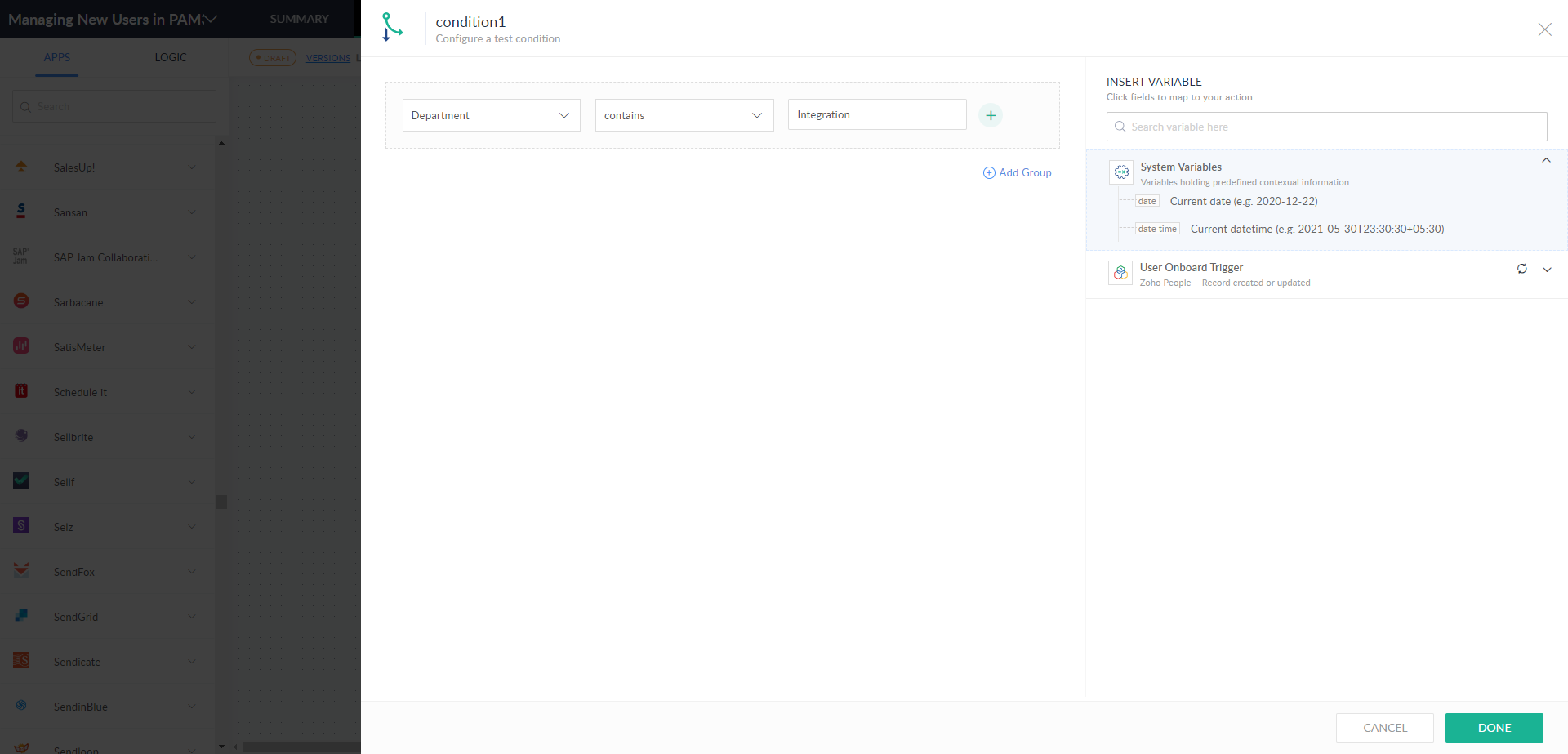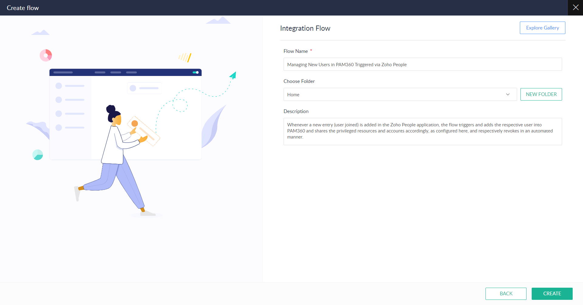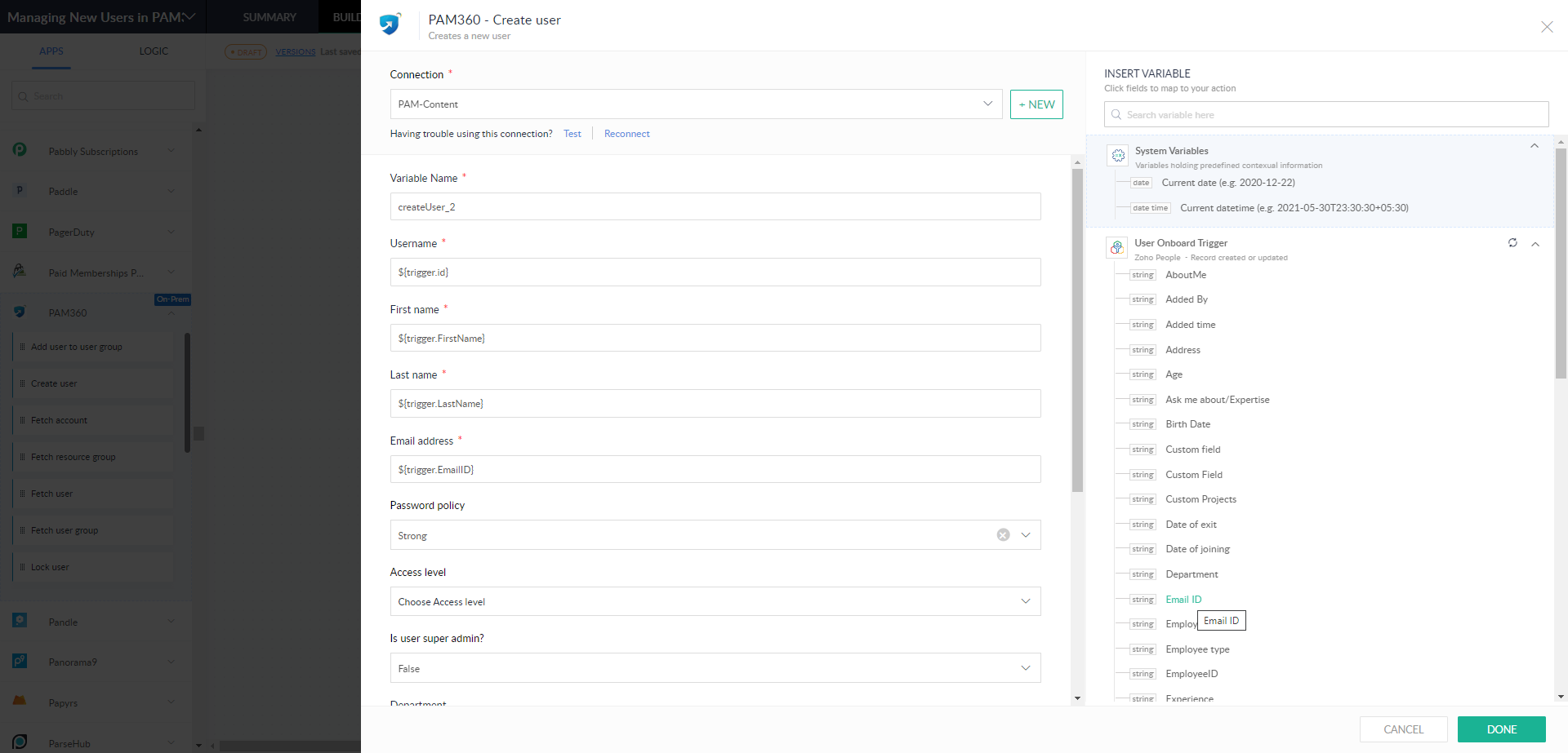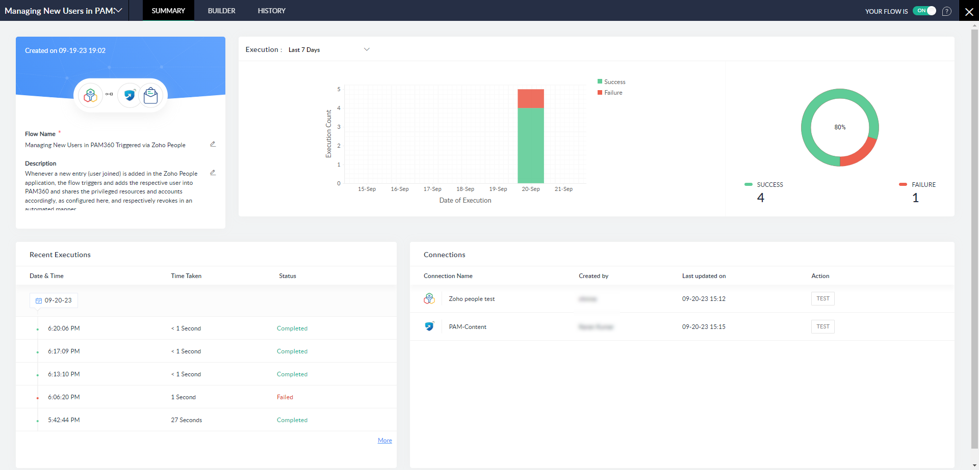 新しいユーザーがZoho People Employeeフォームデータに追加されると、フロートリガーが起動します。フローの決定ロジックにあわせて、ユーザー部門をチェックします。必要な条件が満たされた場合、ユーザーは、PAM360に追加され、フロー属性構成にあわせて、関連すうr特権リソースと共有されます。