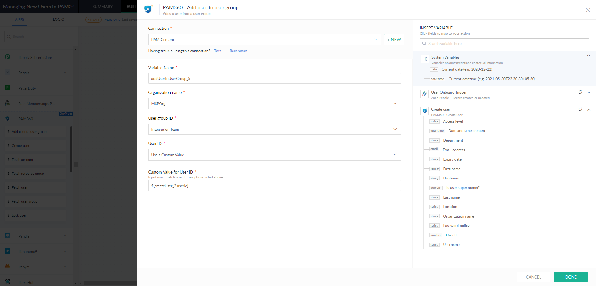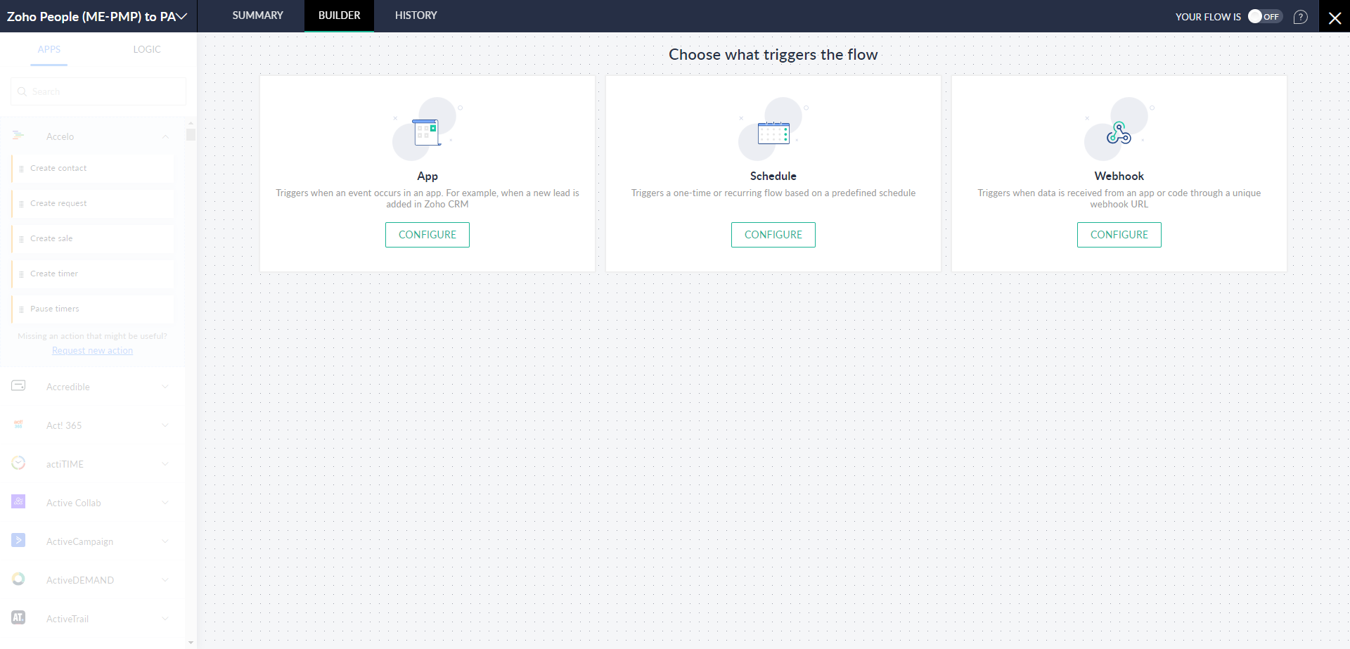 - PAM360と各アプリケーション(ここでは - Zoho People)は、Zoho Flowアプリケーションに接続として追加する必要があります。