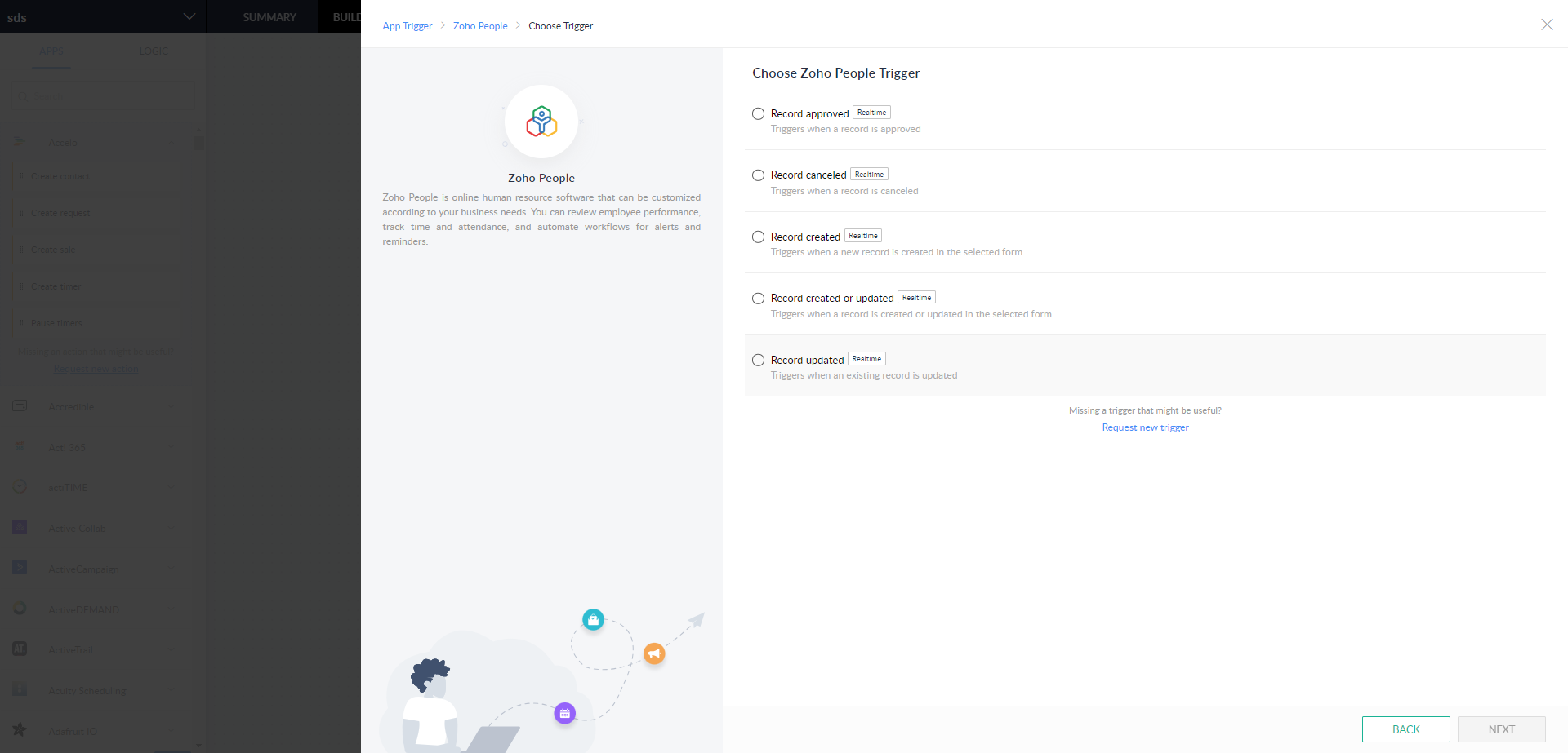 - Zoho PeopleとPAM360との間のユーザー管理に必要なトリガータイプ(ここでは - 作成または更新したレコード)を選択します。