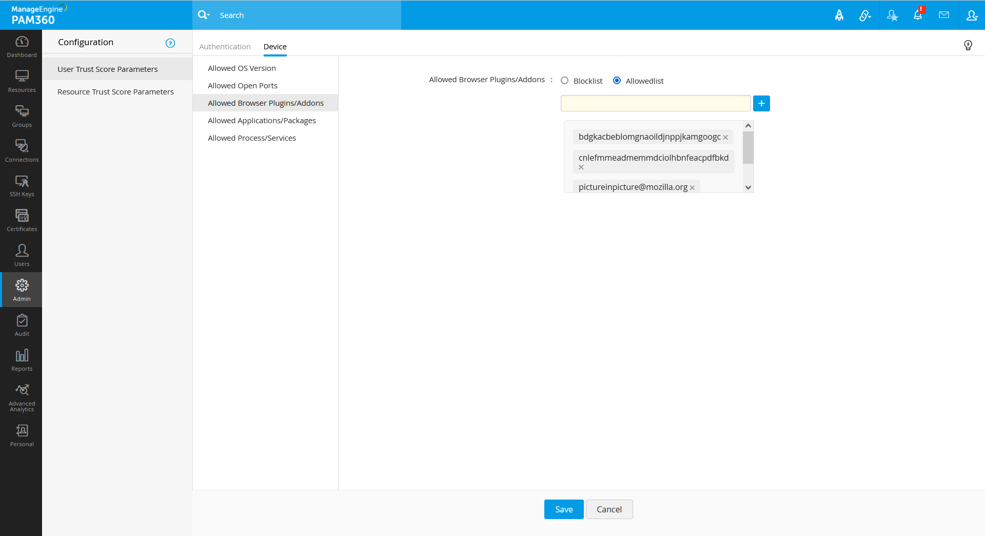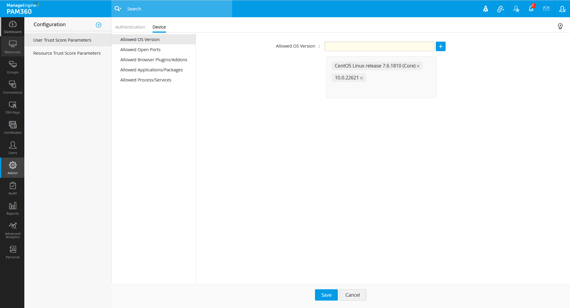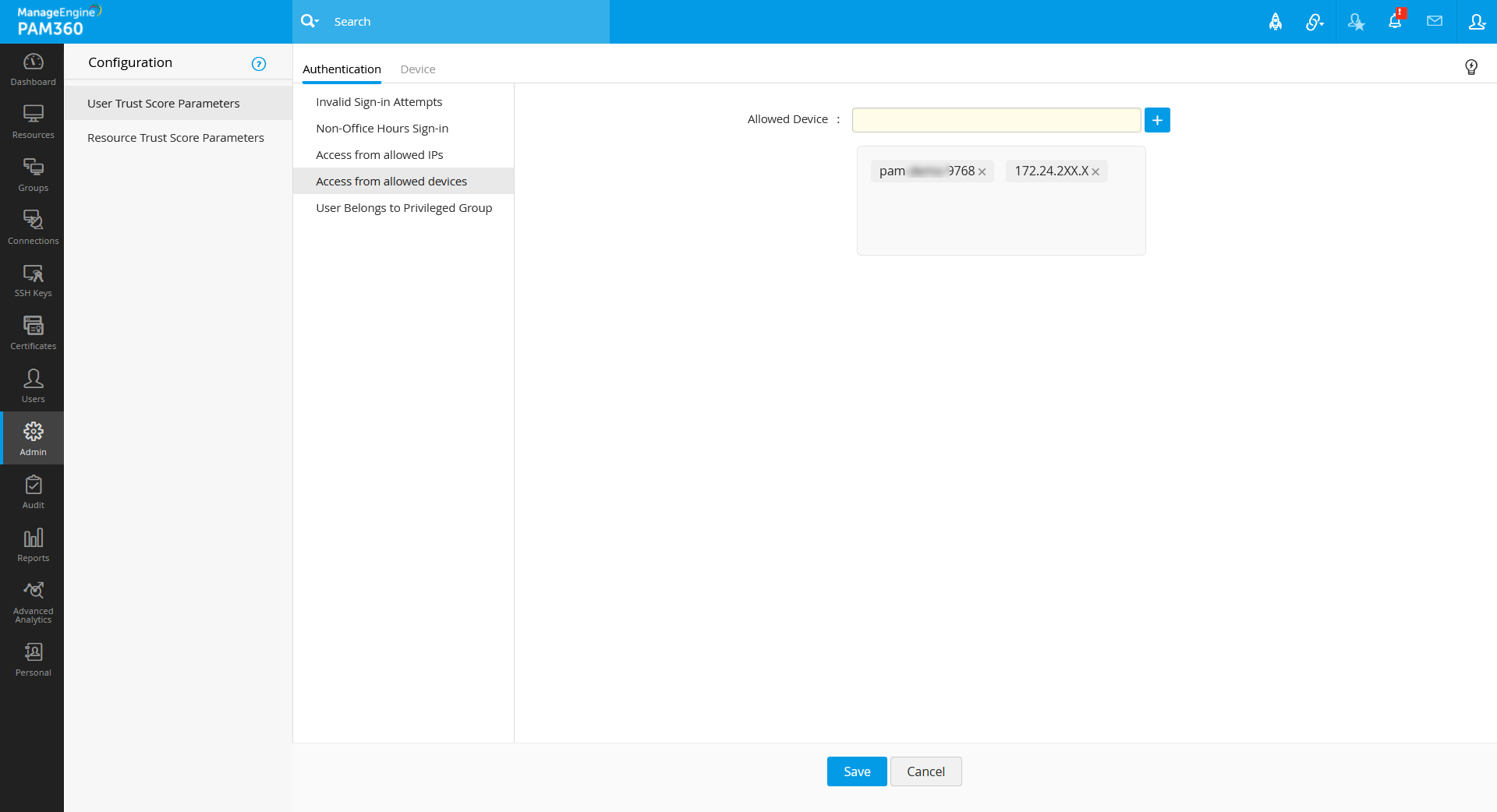 ユーザーが上のIPレンジにあり、PAM360アプリケーションにアクセスする場合、パラメーター条件は満たされ、パラメータースコアがユーザーの信頼スコア全体に追加されます。このパラメーターに準拠しないと、信頼スコアページで割り当てられたパラメーターの重み付けには関係なく、パラメータースコアは0になります。 - 許可されたデバイスからのアクセス - 許可されたIPパラメーターと同様、組織が認可したPAM360アプリケーションにアクセスが許可されたIPアドレスとデバイス名を定義できます。例, 許可されたデバイス: pam-server3592.