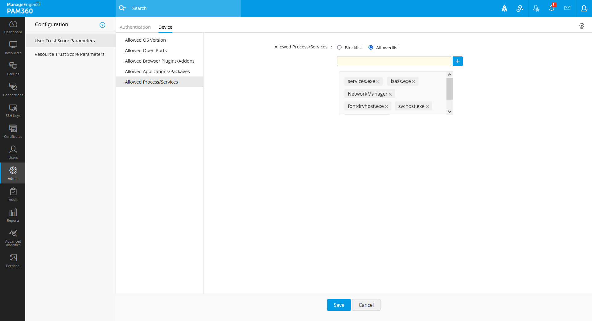 - 許可されたプロセス/サービス - このパラメーターでは、ユーザーのデバイスまたはリソースで実行が個yかされているプロセス/さ―ビスを指定できます。これは、許可された、または制限されたプロセス/サービスのリストを作成することで、可能になります。各ユーザーデバイス/リソースパラメーターの信頼スコアは、実行しているプロセス/サービスにあわせて調節されます。