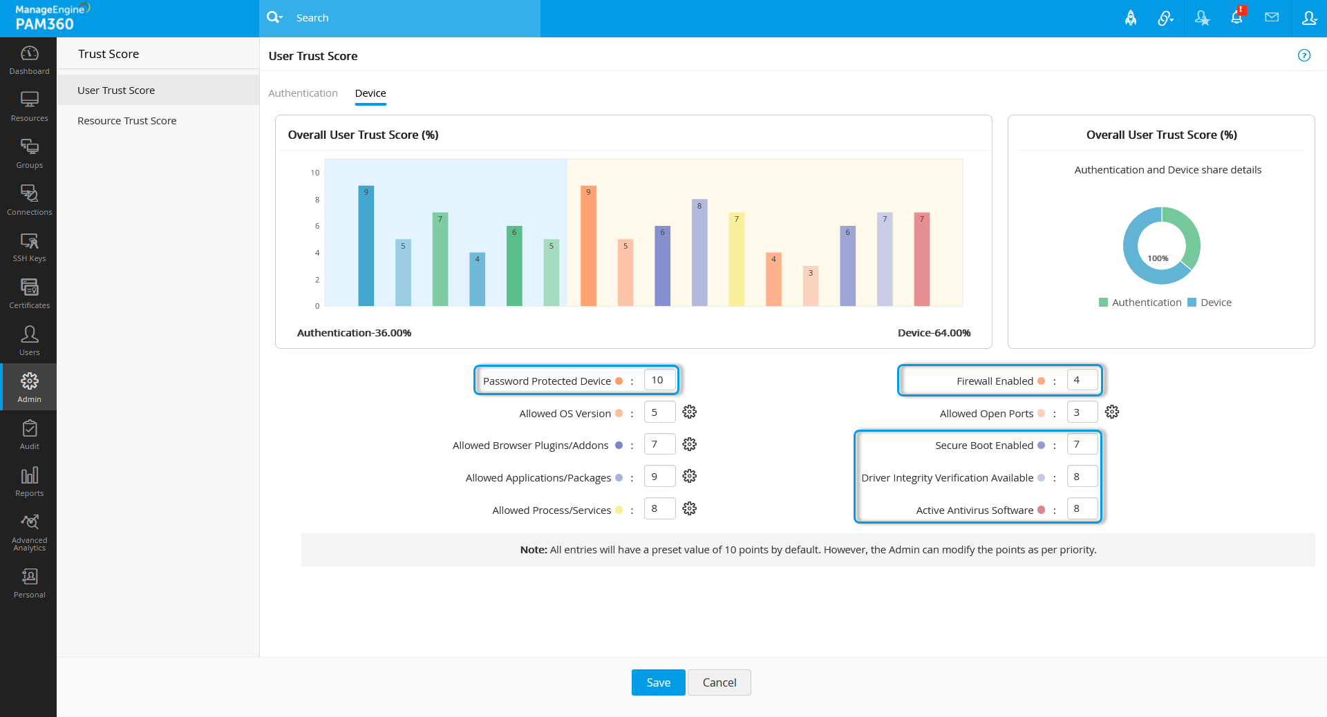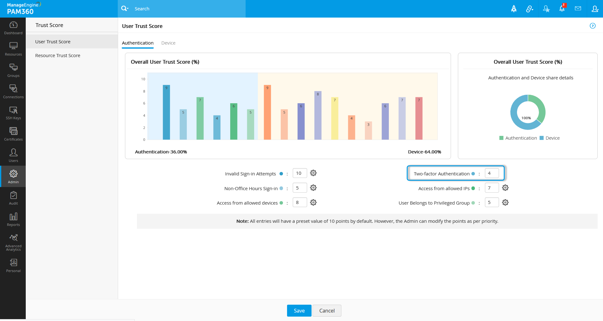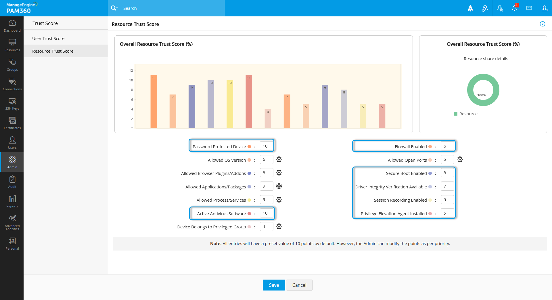 PAM360は、合計19の条件付きおよび事前定義済パラメーターを利用し、ユーザーおよびリソースの信頼スコアを決めます。これらのパラメーターは、2つのカテゴリに分けられます。1つは、ユーザー、もう1つはリソースで、それぞれに重み付けが割り当てられ、各ユーザーとリソースの信頼スコアが計算されます。これらのパラメーターとその割り当てられた重み付けに基づいて、PAM360は、ユーザーとリソースの両方の信頼スコアを計算します。