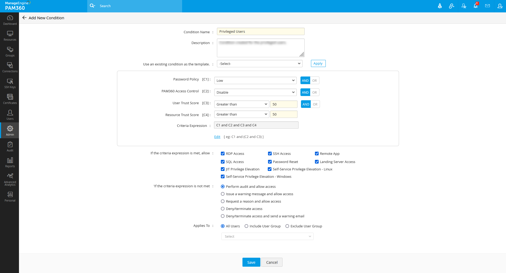 - JIT権限昇格 - このオプションは、すべての基準がこの条件に追加された表現にしたがって満たされている場合、PAM360のアカウントへのジャスト・イン・タイム権限昇格アクセスが可能になります。