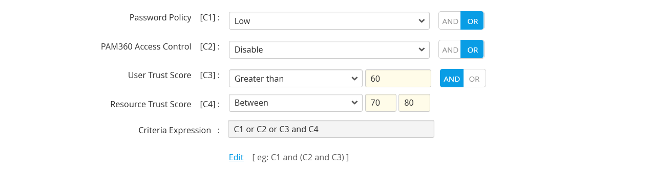 - C基準表現 - この基準表現オプションを使って、アクセスポリシーの条件での基準の(C1、C2、C3、およびC4)重要度をあり方をカスタマイズできます。AND/ORボタンを使って、維持するか、[編集]オプションを使って、基準の重要度を手動で設定できます。例. [C1または(C2とC3)またはC4]