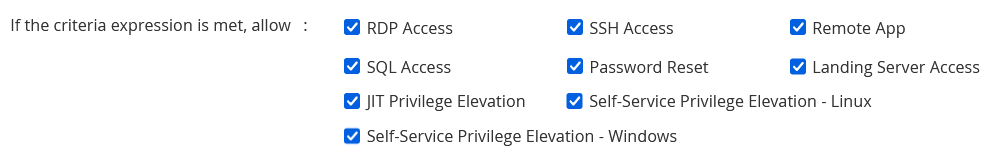 - ランディングサーバーアクセス - これを有効にすると、ユーザーは、基準表現が満たされた場合にプライマリランディングサーバーで構成されたデータセンターのITアセットにリモートアクセスすることができます。