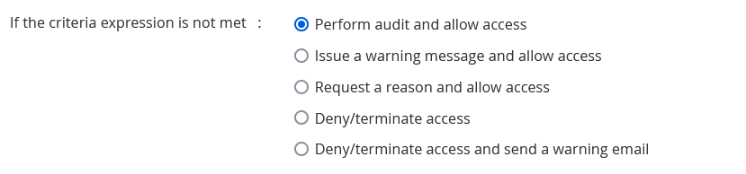- アクセス拒否/終了と警告メール送信 - 条件の構成された基準表現が満たされていない場合、このオプションでは、リソースへのアクセスが拒否され、ユーザーに警告のため、警告メッセージが送信されます。