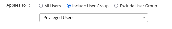 適用先:このオプションでは、ポリシーベースのアクセス権限要件にあわせて、ユーザーを条件に含める、または条件から除外することができます。ユーザーと条件とを関連づけることで、関連ユーザーグループから、ユーザーに各アクセスポリシーを実行することができます。