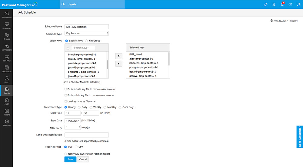 - 鍵のローテーション – ユーザーアカウントに割り当てられたSSH鍵のローテーションをスケジュールします。ローテーションをスケジュールする鍵を選択します。鍵が割り当てられていないがローテーションがスケジュールされている場合、スケジュールのローテーションは失敗し、GUIの[管理≫スケジュール管理]タブと[監査]タブにエラーメッセージが表示されます。鍵ファイル(秘密鍵、公開鍵、または秘密鍵と公開鍵の両方)を関連するユーザーに自動的に配布することもできます。 これを行うには、スケジュールされたローテーションごとに鍵ファイルを手動で配布する代わりに、このページで使用可能な「ユーザーに鍵を配布」オプションを有効にします。