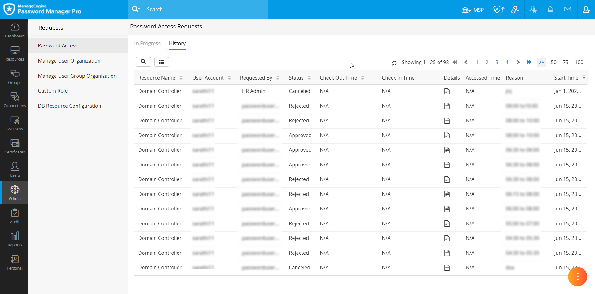 注:ユーザーがパスワードアクセス要求を申請した場合、承認された管理者はリクエストされたアクセス期間が終了する前に、それを承認する必要があります。要求は、指定した終了時刻を過ぎると自動的に無効になります。