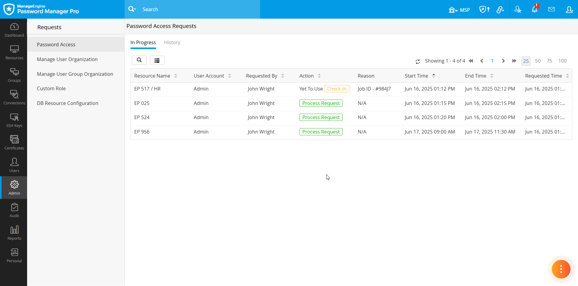 - 「実行中」 - 承認を待っているすべてのパスワードアクセス要求を表示し、アクセス要求が行われたリソースやアカウント名、要求を行ったユーザー、要求の理由、および要求された時刻などの関連情報が含まれています。このウィンドウを通じて、管理者は承認が必要な保留中の要求を確認し、アクセス承認や却下をシームレスに管理することができます。