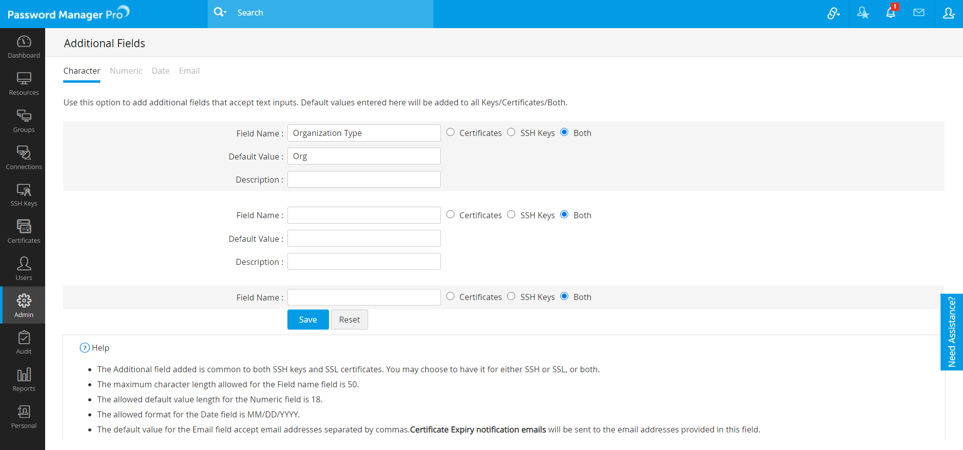 Password Manager Proにて保管しているSSH鍵、SSL/TLS証明書に対して追加の情報を紐づける追加フィールドを使用できます。次の4種類のフィールドを作成できます:文字、数値、日時、Eメール。追加フィールドが作成されると、追加フィールドにて設定されたデフォルトの値はSSH鍵タブ、証明書タブの全てのエントリーに対して適用され、全ユーザーが閲覧できるようになります。それ故に組織名やEメールアドレス等の共有の属性を追加フィールドに設定されることがベストプラクティスとなります。列セレクターアイコンはSSH鍵タブ、証明書タブのビューにおける列、フィード、レポートタブやダッシュボードタブ