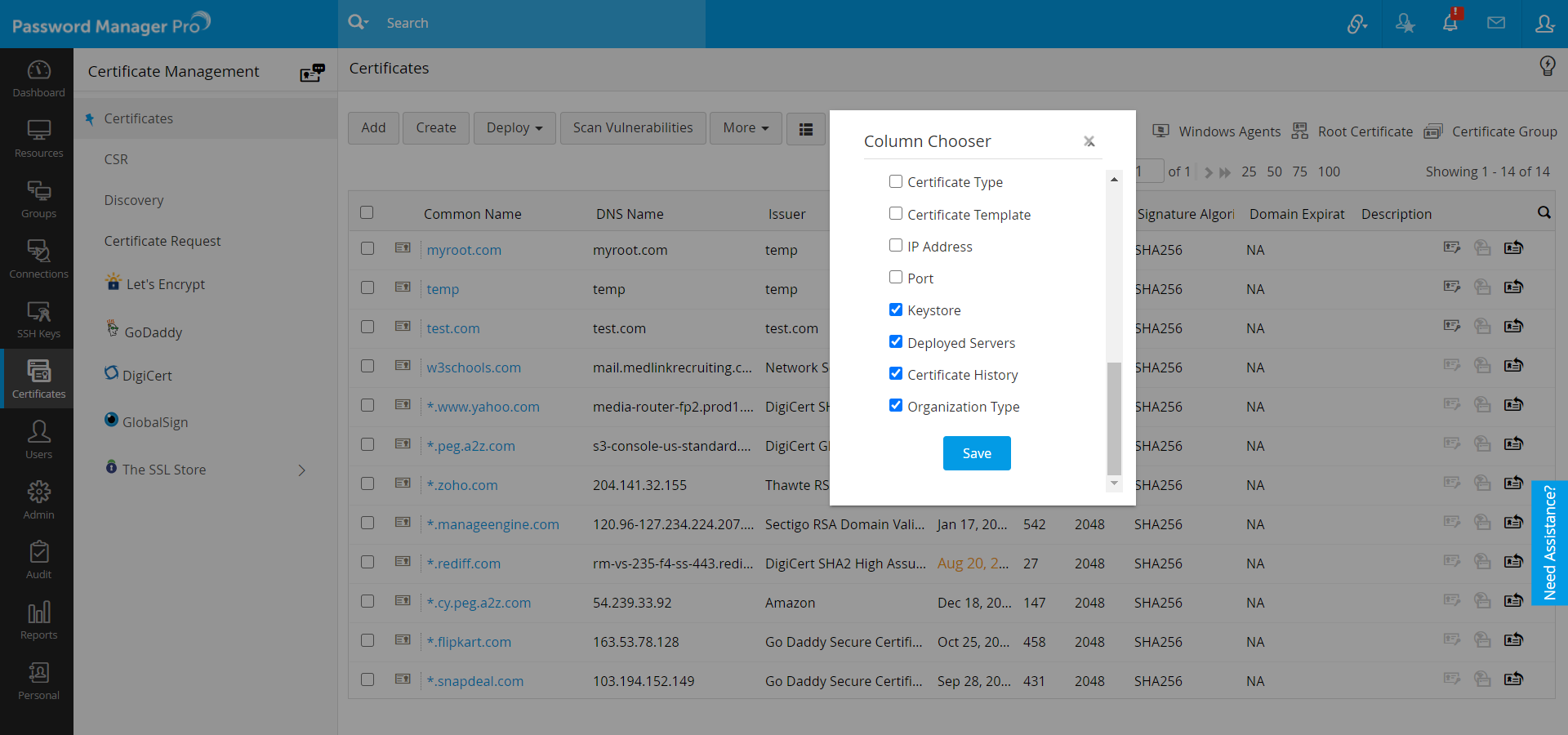 )をクリックします。 - 列セレクターのポップアップ画面から、追加したフィールドのチェックボックスを選択し、保存をクリックします。他の列に混ざって追加したフィールド及びその規定値が表示されるようになります。そのフィールドの値はすべてのSSH鍵、SSL証明書のエントリーに対して適用されますが、編集オプションから編集、カスタマイズ可能です。
