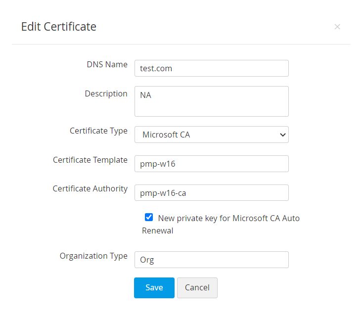 - 証明書を編集のウィンドウにて、値を編集し、保存をクリックします。選択された証明書にてのみ値は更新されます。