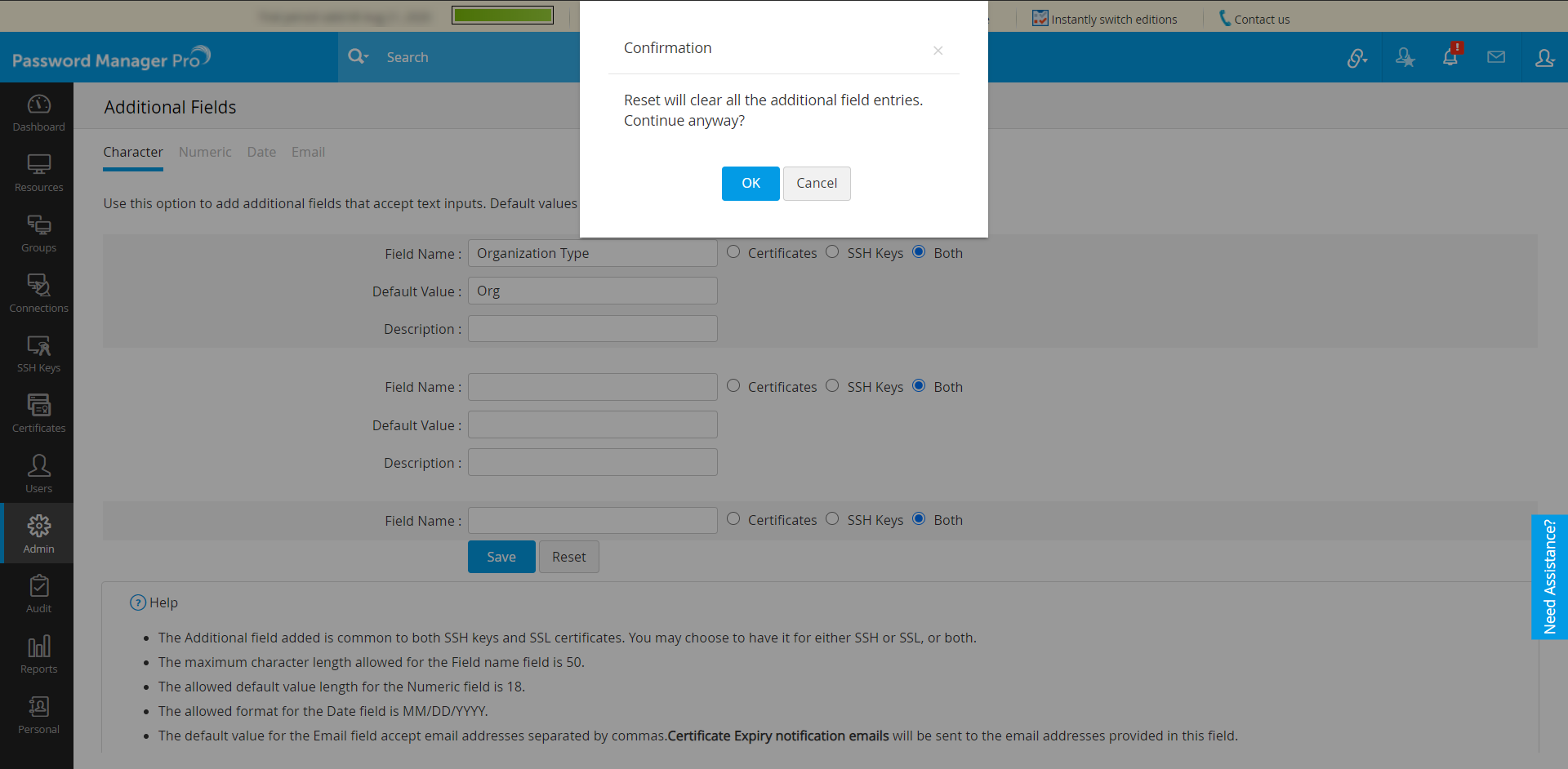 - リセットは画面下部にて選択できます。表示されたポップアップ画面を確認し、OKをクリックします。この処理によって「SSH鍵」タブ、「証明書」タブの双方において当該の追加フィールドは削除されます。