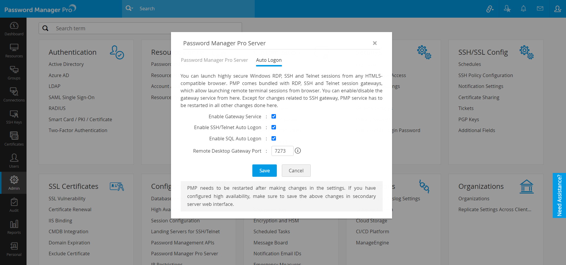 注:Password Manager Pro がインストールされると、インスタンスの自己署名 SSL 証明書が生成されます。この証明書は、自動ログオン ゲートウェイでもトラフィックを暗号化するために使用されます。Password Manager Pro インスタンスをエンド ユーザーに公開する前に、CA 署名付き証明書をそのインスタンスに適用することをお勧めします。自己署名証明書の場合、ユーザーが URL でゲートウェイ ポートを明示的に指定し、警告を受け入れて自己署名証明書をインストールしない限り、ゲートウェイに接続することはできません。(固有の SSL 証明書を生成する手順については、当社サイトのこちらを参照してください)。