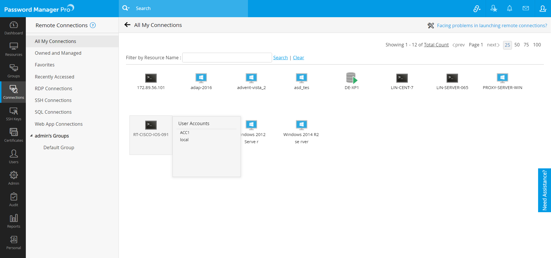 管理者が 3 つのリモート ターミナル セッションの種類 (Windows RDP、SSH、および SQL セッション) のいずれかをサポートするリソースを追加するとすぐに、追加の構成を行わなくても、そのリソースにアクセスできるシステム内のすべてのユーザーがその機能を利用できるようになります。[接続] タブを使用すると、ユーザーはリモート アカウントを簡単に見つけて、ワンクリックでセッションを開始できます。
