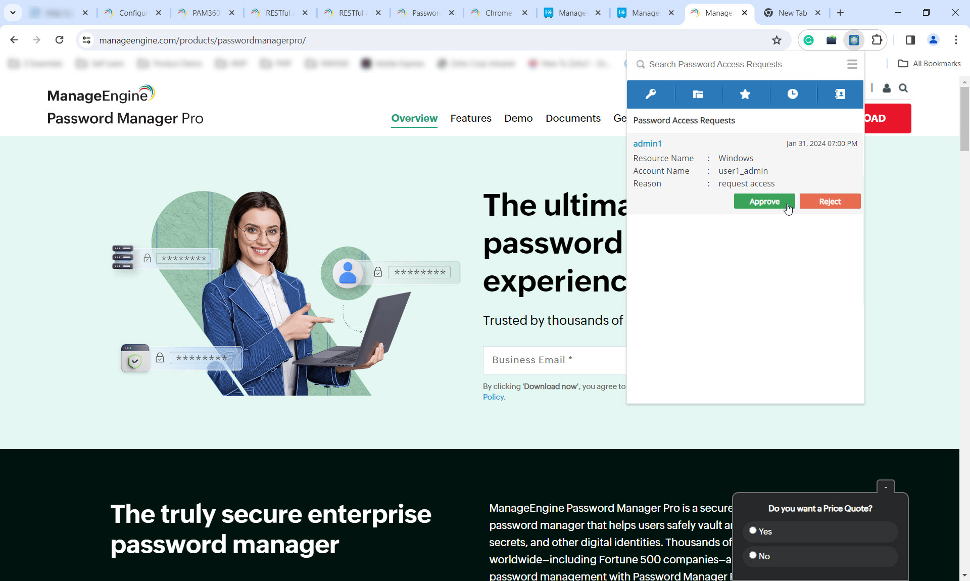お使いのWebコンソールでアクセス制御ワークフローを構成して特別レベルのセキュリティを設定した場合、ブラウザ拡張機能はユーザーにアクセス要求と、コメントまたはチケットidを提出してパスワードにアクセスするように求めます。管理者は、必要に応じて、ユーザーのアクセス要求に対して承認を許可または拒否できます。
