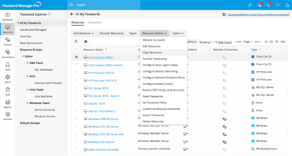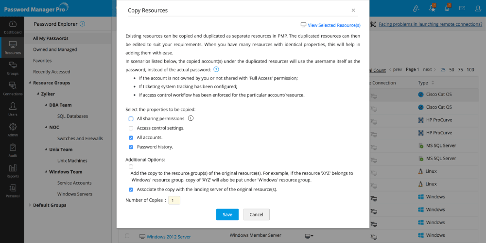 プロパティが同一のリソースが多数ある場合、1つのリソースを追加し、そのコピーを複数Password Manager Proにすることができます。これで、リソースの一括追加プロセスが簡素化されます。1つのリソースまたは複数のリソースをコピーし、それらをPassword Manager Proの別のリソースとして複製することができます。複製したリソースの属性は、要件に合うように編集できます。