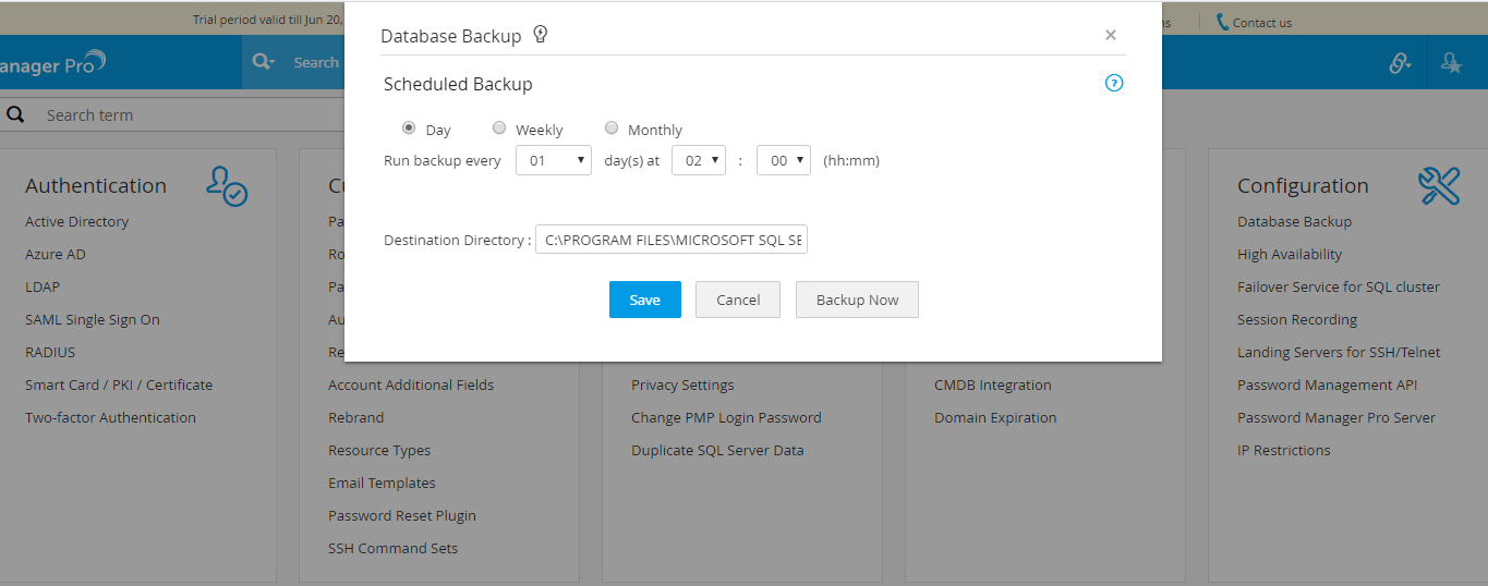 Password Manager Proデータベースに保存されているデータは非常に重要です。本番環境では、参照目的または災害復旧のため、データのバックアップは常に必要です。データベースのコンテンツを定期的にバックアップするようにタスクをスケジュール設定することができます。バックアップは、デフォルトでは、SQLサーバーが実行されているホストに.zipファイルで保存されます。すべての機密データは、そのファイル内で暗号化されたままになります。