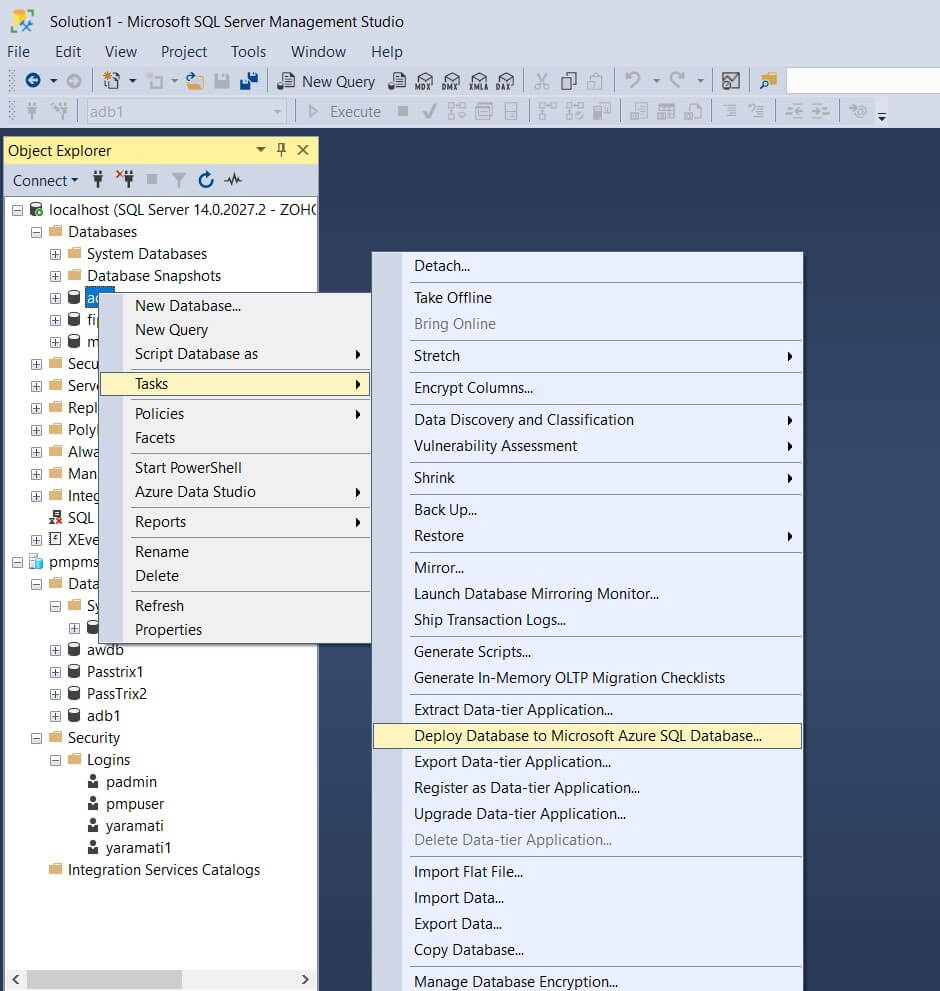 - 次に、データベースを右クリックし、[タスク] >> [データベースをMicrosoft Azure SQLデータベースに展開]の順に移動します。