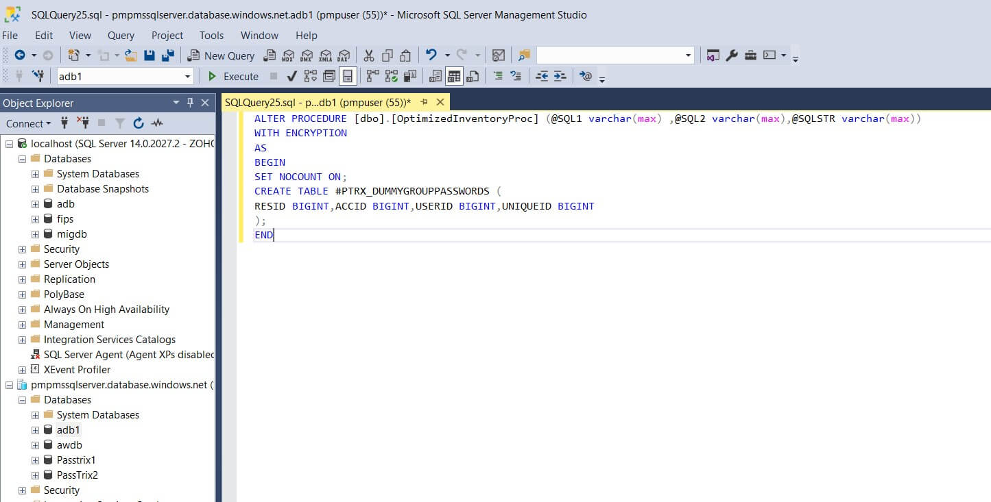 ALTER PROCEDURE [dbo].[OptimizedInventoryProc] (@SQL1 varchar(max) ,@SQL2 varchar(max),@SQLSTR varchar(max)) WITH ENCRYPTION AS BEGIN SET NOCOUNT ON; CREATE TABLE #PTRX_DUMMYGROUPPASSWORDS ( RESID BIGINT,ACCID BIGINT,USERID BIGINT,UNIQUEID BIGINT ); END