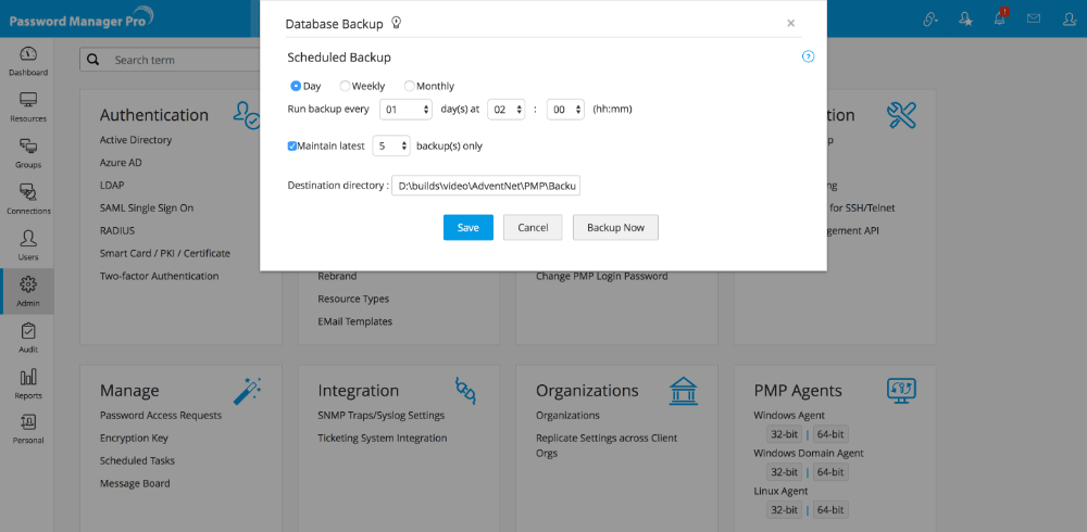 Password Manager Proに保存されているデータは非常に重要です。本番環境では、参照目的または災害復旧のため、データのバックアップは常に必要です。この実現のため、Password Manager Proには、データベースバックアップ機能が付いています。