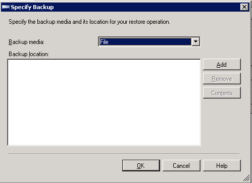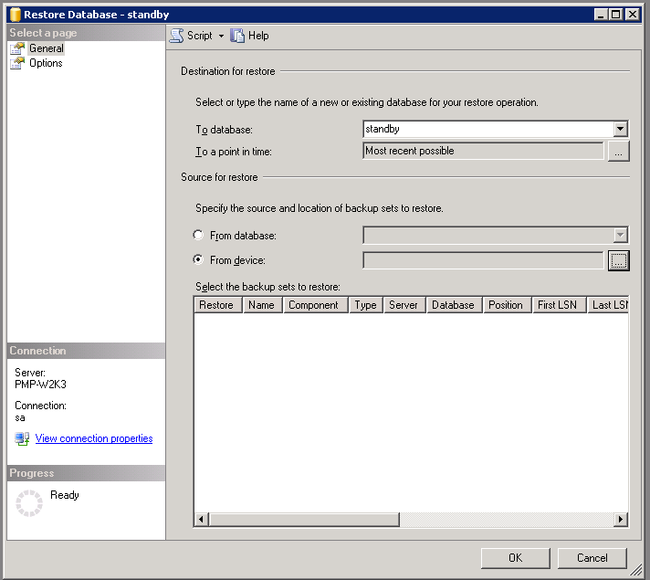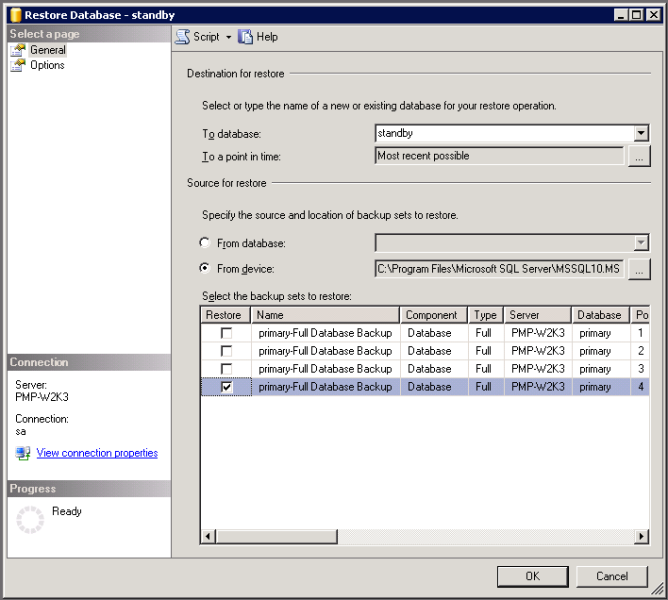 [データベースをリストア]ウインドウ上で、デバイスからオプションを選択し、 [...] ボタンをクリックしてPMPバックアップ ファイルを指定します。