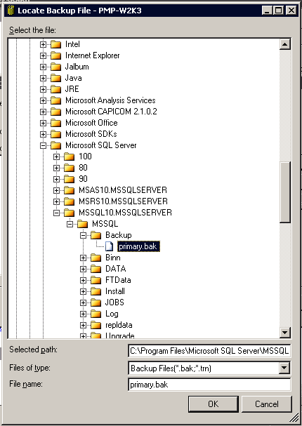 PMPのバックアップファイルをSQL Serverからコピーします。デフォルトでは<MS SQL Server>/Backupフォルダーに、pmpbackup_pmpversion_backupdate-time.bakというような名前のファイルで保存されています。(例:pmpbackup_6400_110721-1159.bak).