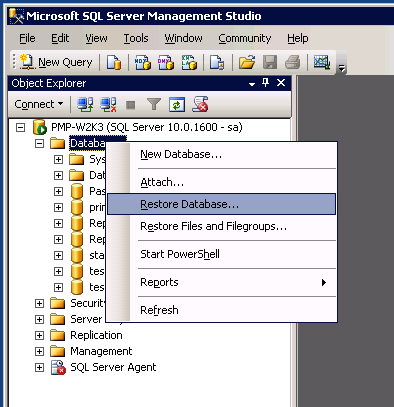 PMPバックアップ ファイルを復元したSQL Serverに接続します。