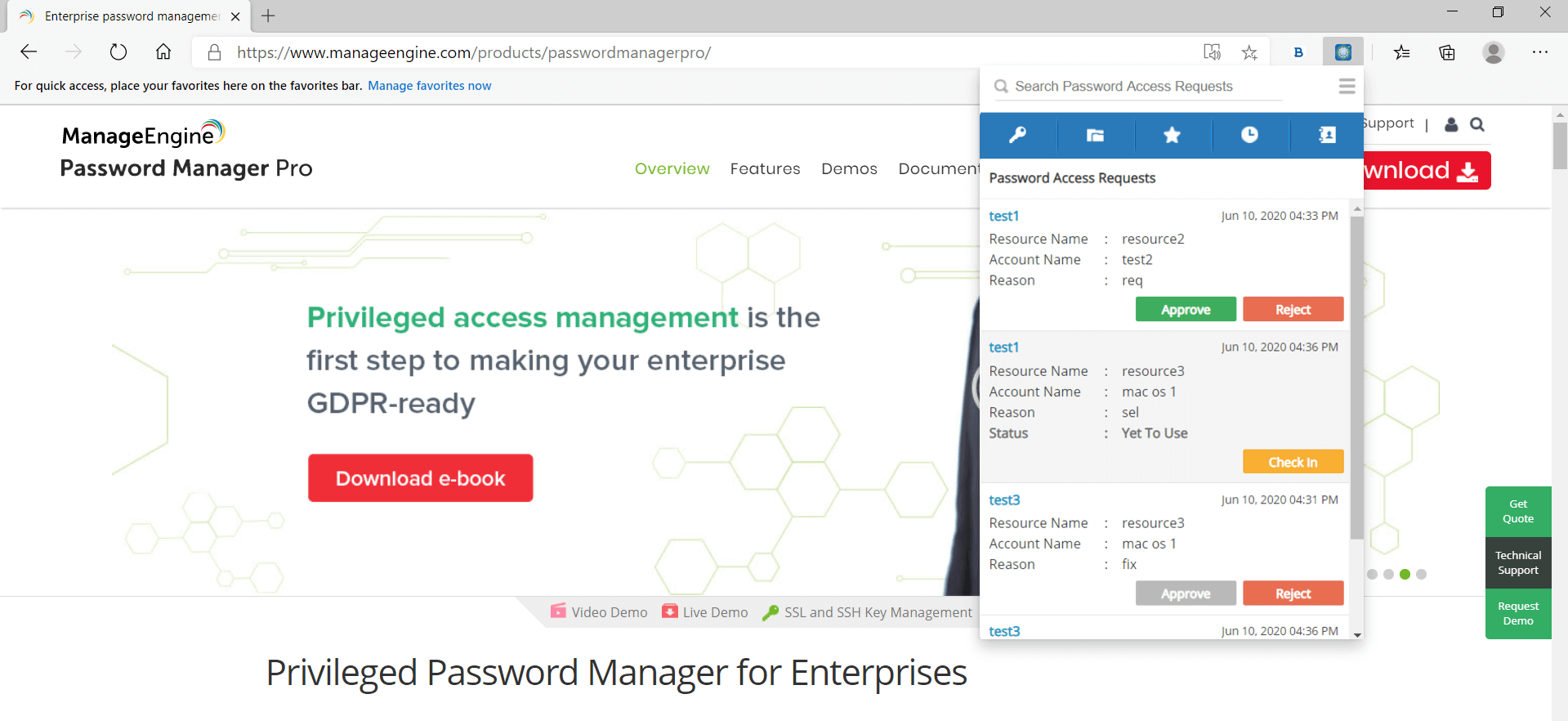 お使いのWebコンソールでアクセス制御ワークフローを構成して特別レベルのセキュリティを設定した場合、ブラウザ拡張機能はユーザーにアクセス要求と、コメントまたはチケットidを提出してパスワードにアクセスするように求めます。管理者は、必要に応じて、ユーザーのアクセス要求に対して承認を許可または拒否できます。