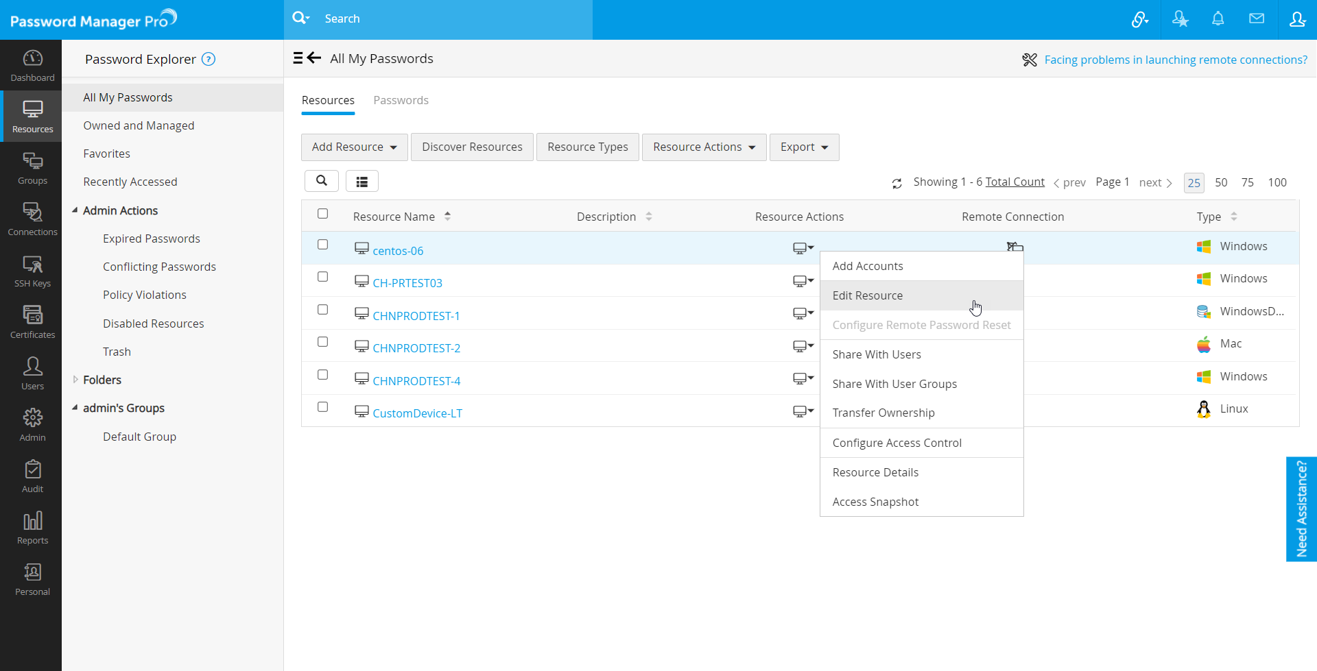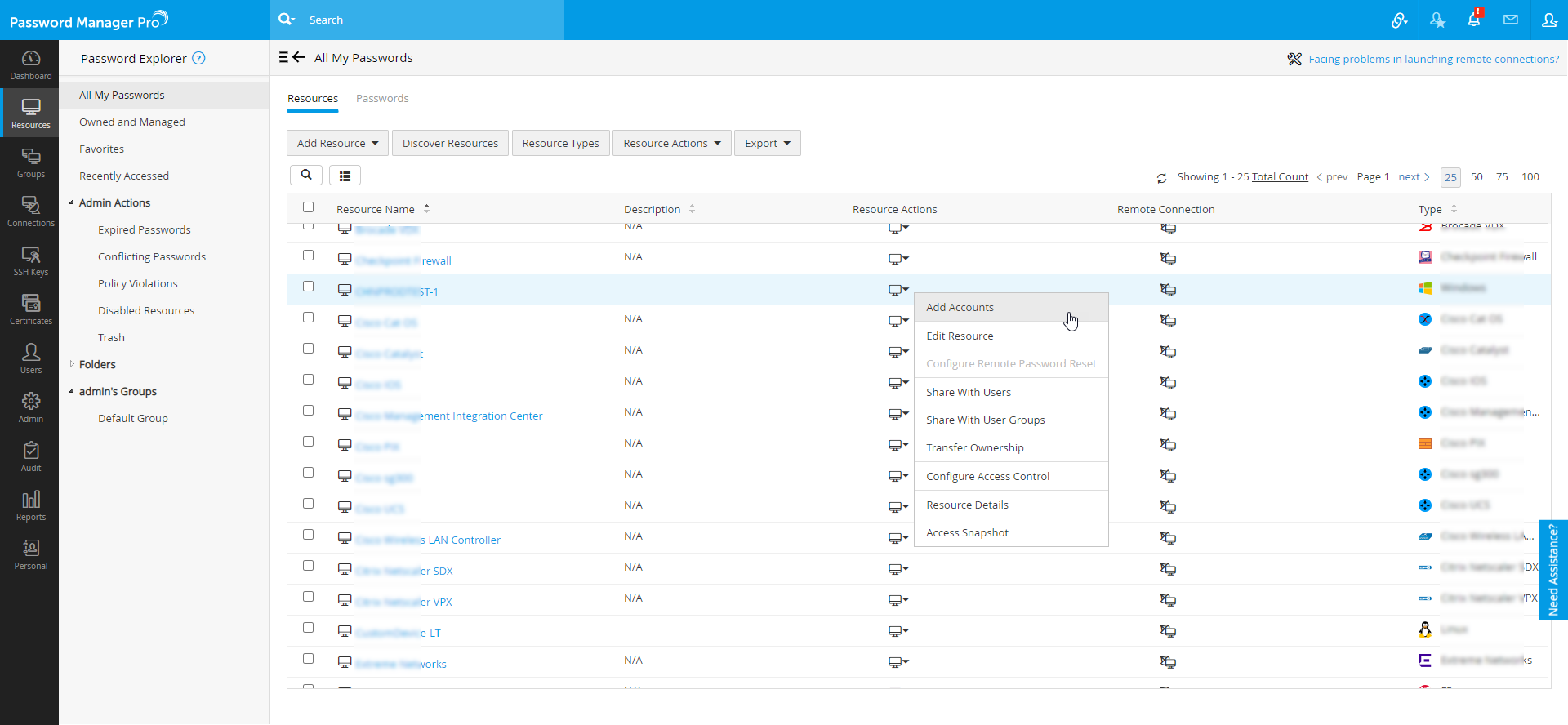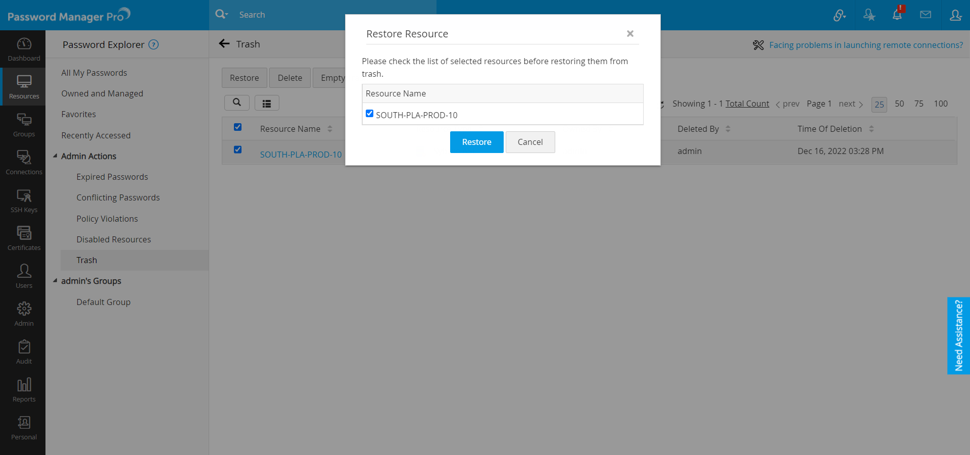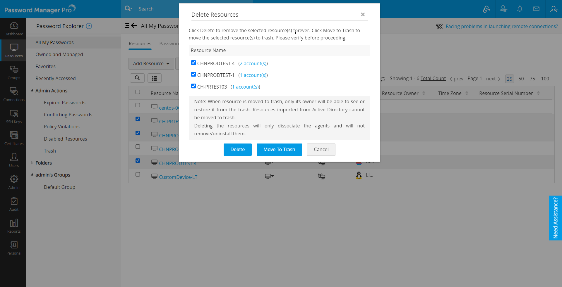 - ゴミ箱に移動されたリソースは、Password Manager Proから削除されず、Password Manager Proの暗号化鍵がローテーションされるまで、いつでも復元可能です。