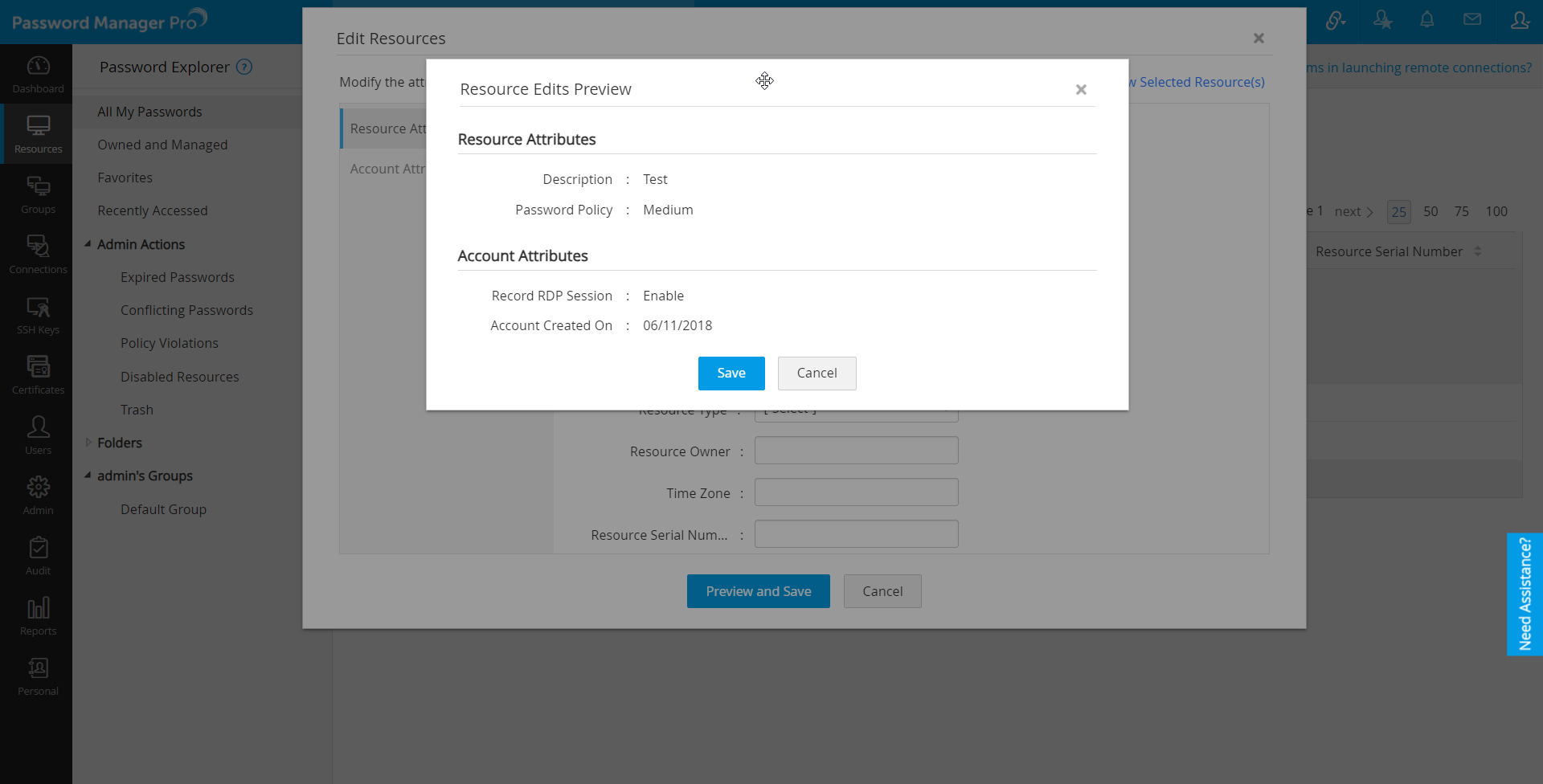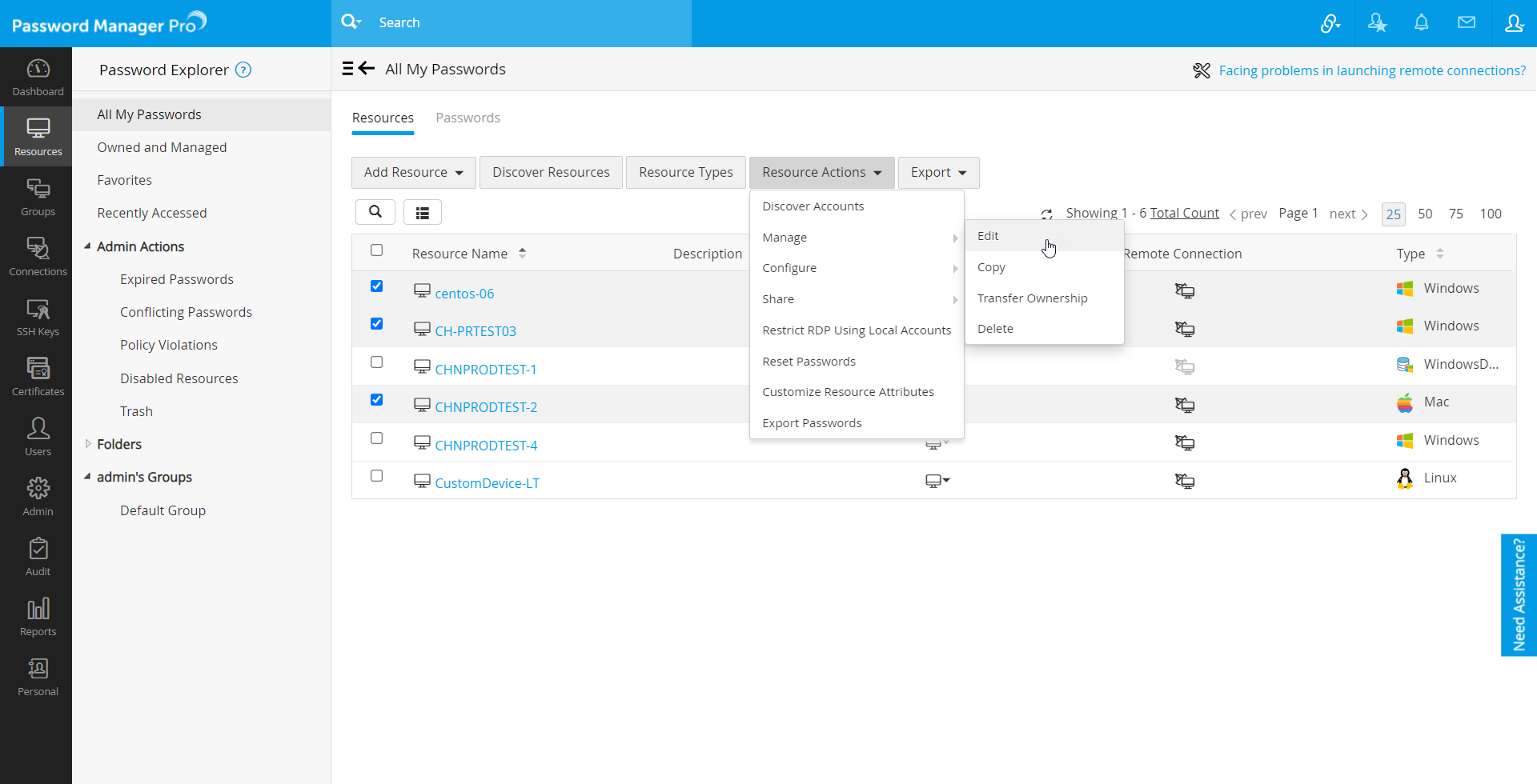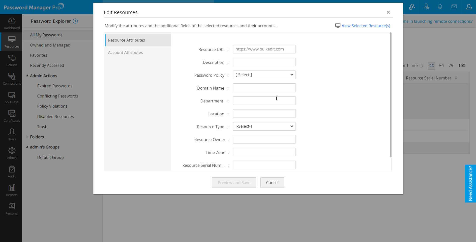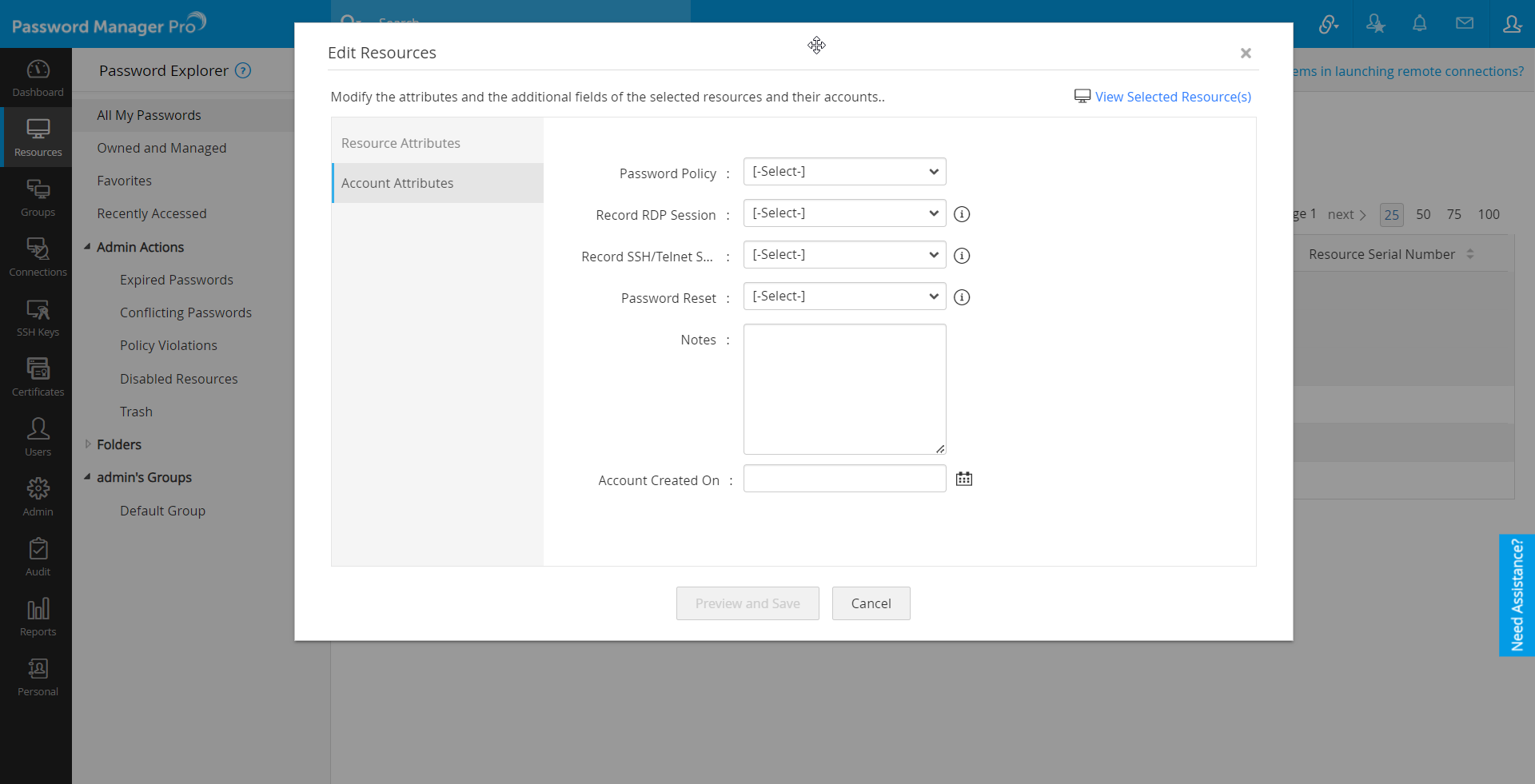 - リソースを一括編集する場合、編集したリソースのチェックボックスにチェックを入れ、 上部の[リソースアクション]→[管理]→[編集]の順に進みます。ポップアップ形式で表示された複数リソースを編集ウィンドウが表示されます。ここで、選択したリソースとそのアカウントの属性と追加フィールドを変更できます。