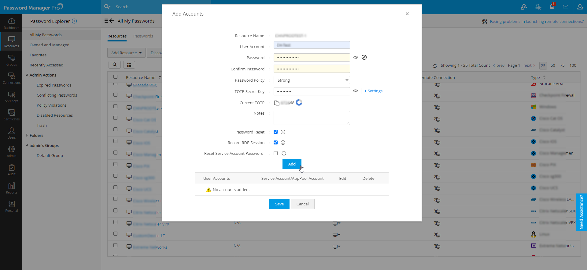 パスワードポリシー、RDPセッション記録、SSH/Telnetセッション記録、パスワードリセットおよびメモ。 - 既に追加フィールドを設定している場合、 [リソース属性]と[アカウント属性]の両方のウィンドウのデフォルト属性の下に表示されます。追加フィールドの作成方法は、ここをクリックしてください。