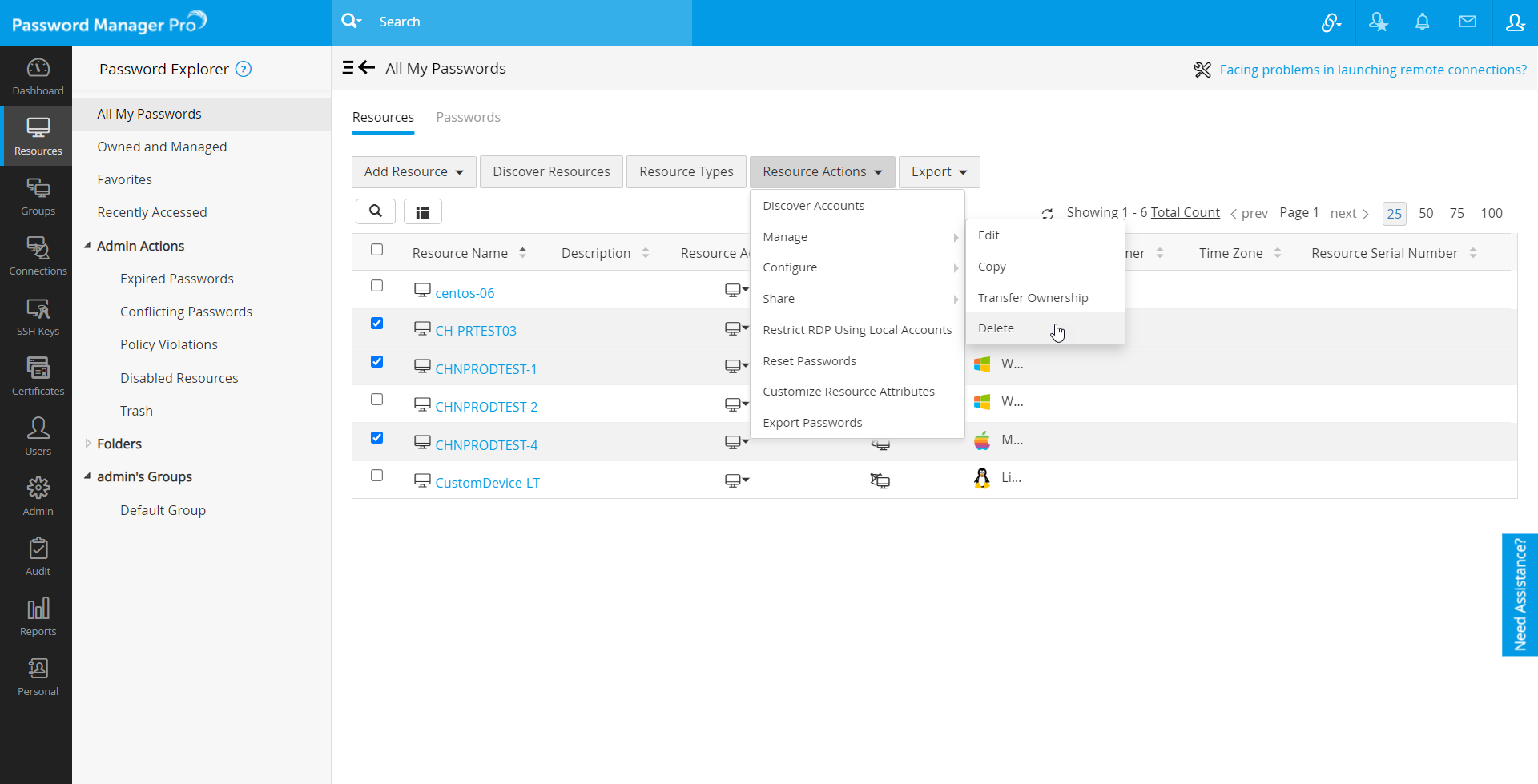 必要なくなったリソースをPassword Manager Proから削除することが可能です。リソースを削除する場合、リソースに含まれているすべてのアカウントやパスワードが完全に削除されます。あるいは、リソースをゴミ箱に移動して、後で復元できるようにすることも可能です。