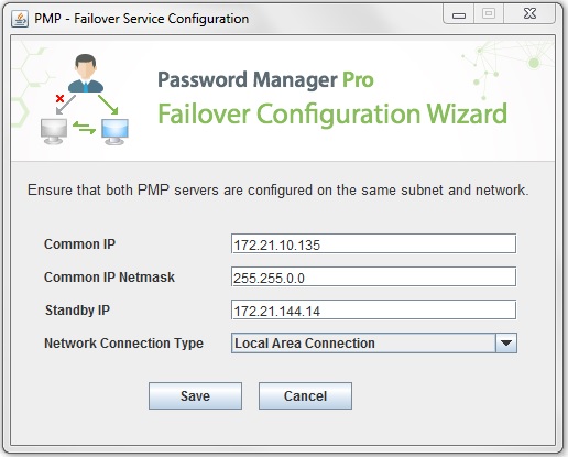 共通 IP:プライマリ、スタンバイの両PMPサーバーに共通のIPを割り当ててください。そうすると、PMPは、常時この特定のIPに接続することができます。PMPサーバーは、この単一のパブリックIPにより結合され、プライマリ、もしくはスタンバイとして稼働しているか関係なく、エンドユーザーは、同じパブリックIPに接続することができます。 ここで入力する共通IPは、静的であり、他のマシンに割り当ててはいけません。