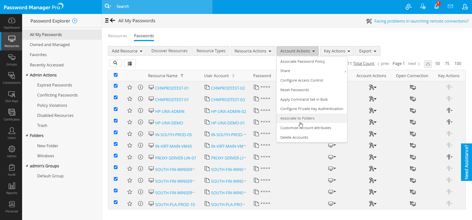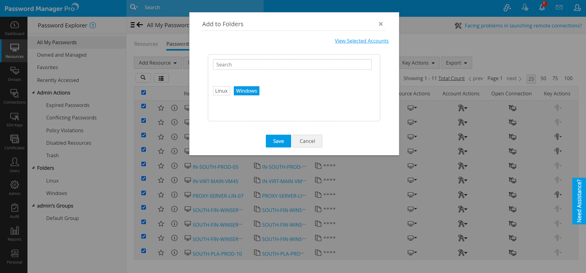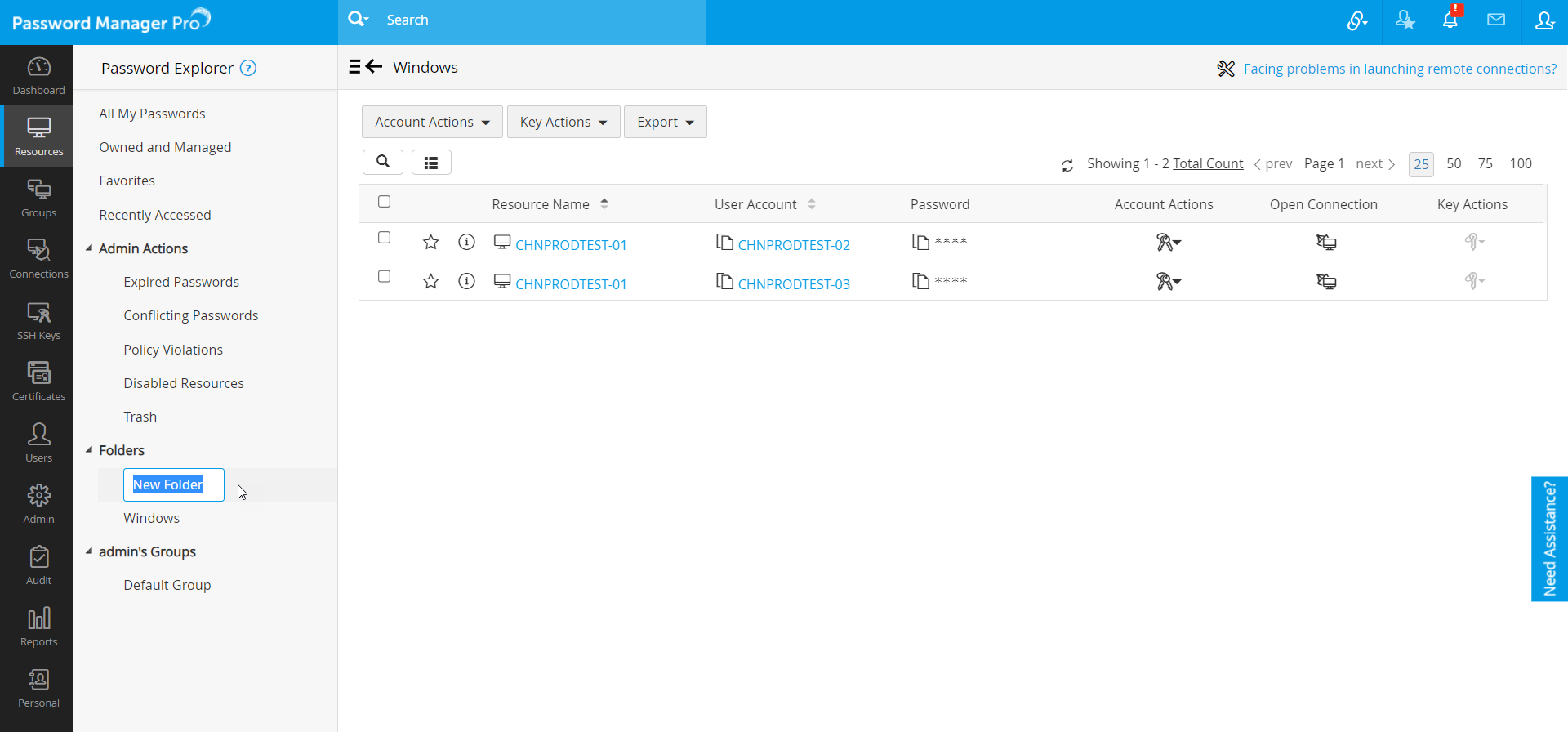 Password Manager Proでは、管理とアクセスを容易にするために、要件に基づいて必要なアカウントを様々なカスタムフォルダに結合して並べ替えることが可能です。各アカウントをそれぞれ選択する代わりに、フォルダ内の複数のアカウントを一度に選択し、ユーザーの権限に基づき一括で、操作を実行できます。フォルダには、[リソース]タブおよび[接続]タブからアクセスできます。ただし、フォルダを作成または変更できるのは[リソース]タブからのみで、[接続]タブには[リソース]タブからフォルダに加えられたすべての変更が反映されます。フォルダはユーザー固有のも二であるため、他のユーザーへ共有できないことに注意が必要です。