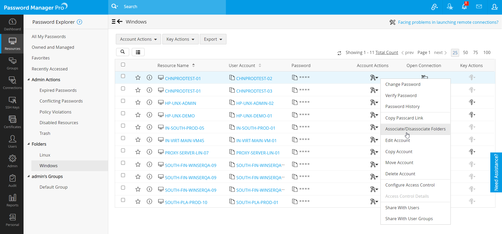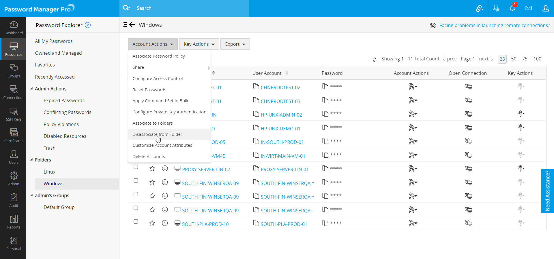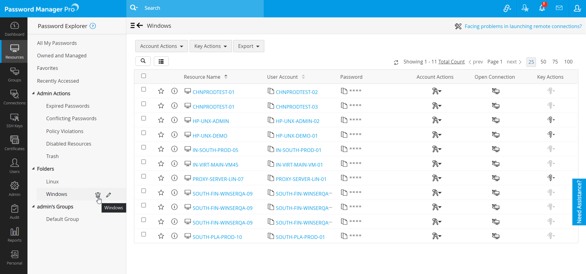 Password Manager Proでは、管理とアクセスを容易にするために、要件に基づいて必要なアカウントを様々なカスタムフォルダに結合して並べ替えることが可能です。各アカウントをそれぞれ選択する代わりに、フォルダ内の複数のアカウントを一度に選択し、ユーザーの権限に基づき一括で、操作を実行できます。フォルダには、[リソース]タブおよび[接続]タブからアクセスできます。ただし、フォルダを作成または変更できるのは[リソース]タブからのみで、[接続]タブには[リソース]タブからフォルダに加えられたすべての変更が反映されます。フォルダはユーザー固有のも二であるため、他のユーザーへ共有できないことに注意が必要です。