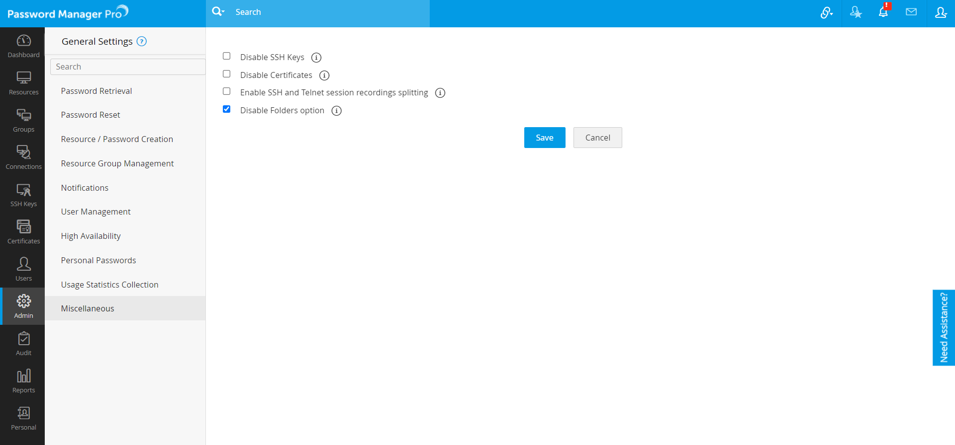 - 次に、[フォルダオプションを無効にする]にチェックを入れ、Password Manager Proのすべてのユーザーのフォルダ機能を無効化します。