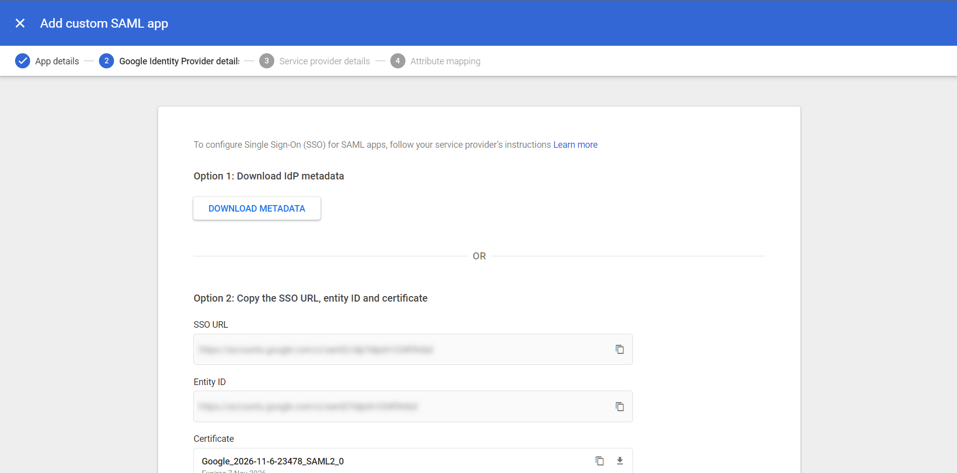 - 「サービスプロバイダーの詳細」において、エンティティID、アサーションコンシューマーURLがあります。これらの値をコピーします。