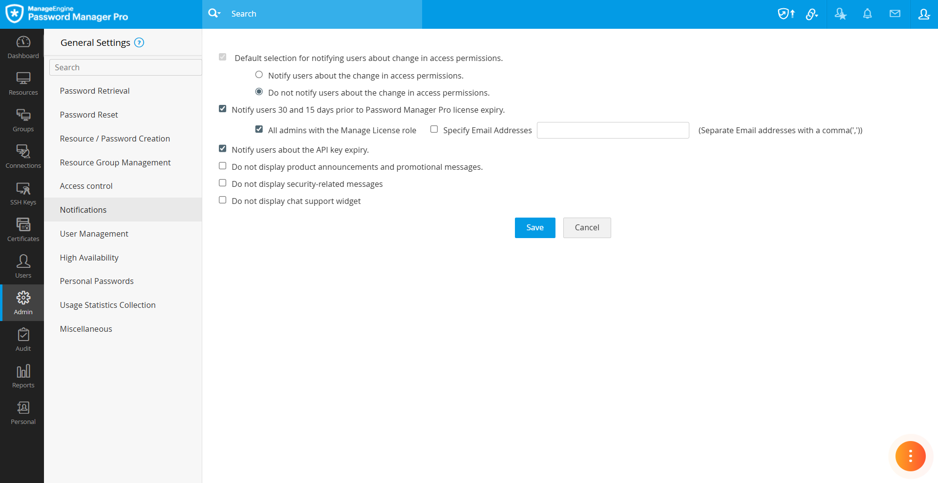 Password Manager Pro (PMP)の一般設定のセクションでは、パスワードポリシーの強制やパスワードを忘れた場合のユーザーのパスワード変更オプション、ユーザー作成や役割変更時のメール通知の設定、個人用パスワードの管理設定、リソースのエクスポート、リモートパスワード変更設定など重要な設定を変更することができます。