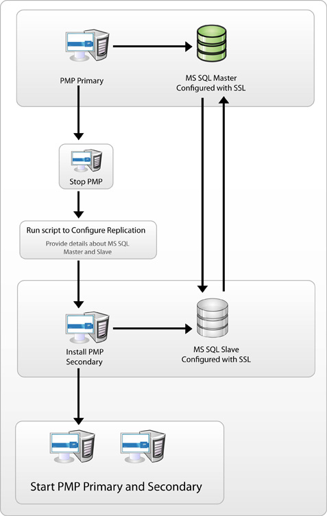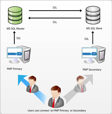 - プライマリとセカンダリのデータは常に相互同期されています。PMPはSQL サーバーのデータベース複製機能を使用してデータの同期を行います。データのレプリケーションは、安全な、暗号化されたチャネルを通じて行われます。