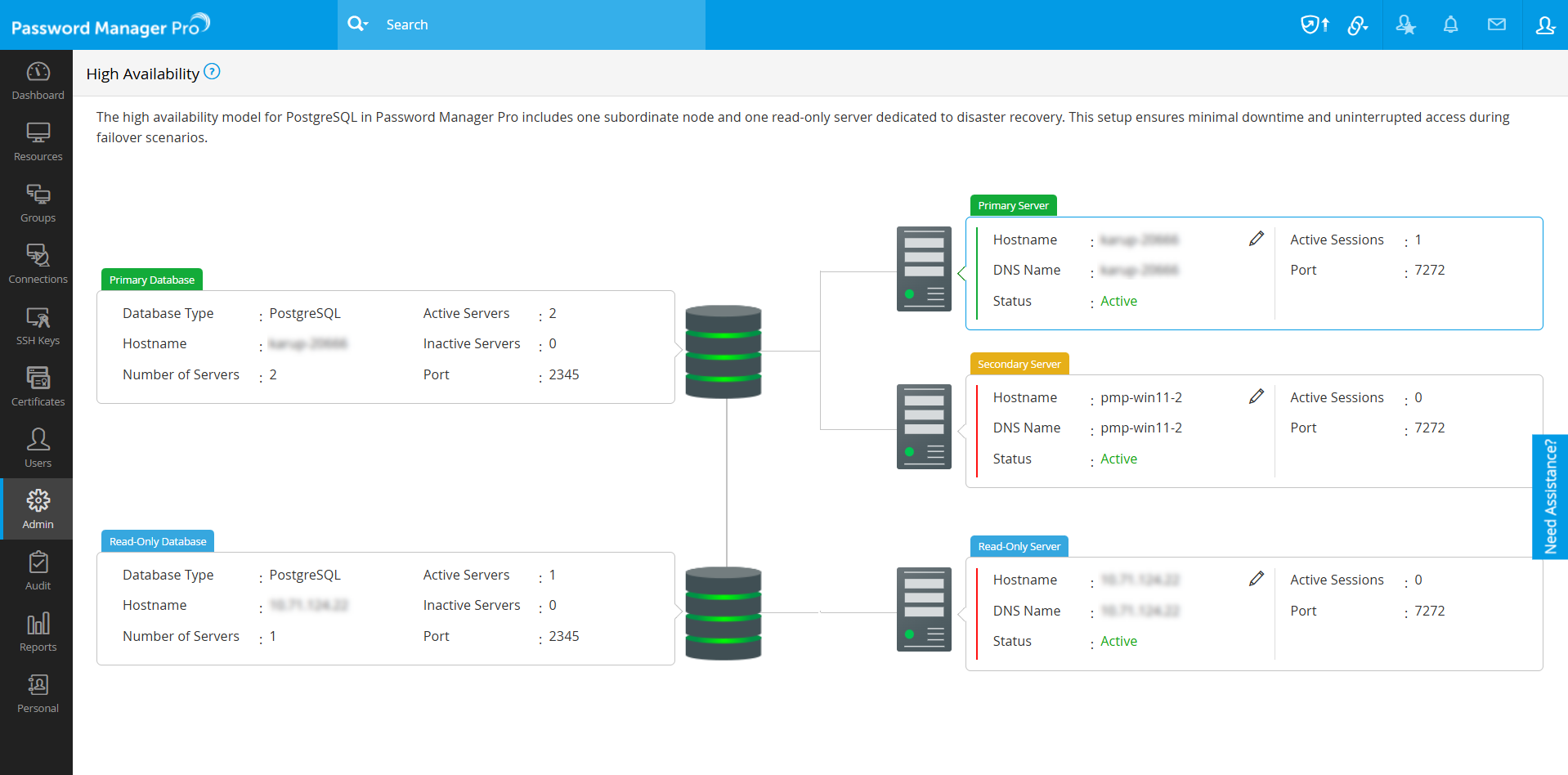 [管理]タブ→[設定]→[高可用性] において、いずれかのサーバーのステータスが『非アクティブ(inactive)』と表示される場合、Password Manager Proサービスが稼働していないか、PostgreSQLのレプリケーション設定に問題があるか、あるいはプライマリ・セカンダリ・リードオンリーサーバー間のネットワーク通信に問題が発生している可能性があります。この問題を解決するには、以下の手順に従ってください。