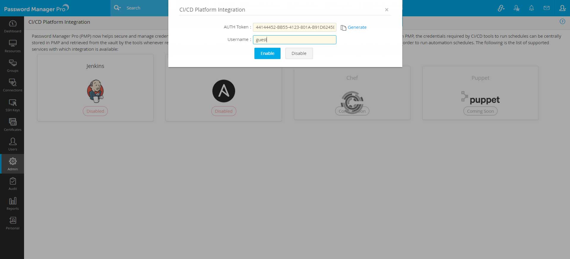 - AUTHトークン: [生成]をクリックして、AUTHトークンを自動的に入力します。これは、後で Jenkins のコンソールでプラグインを構成するときに必要になります。セットアップが完了すると、Jenkins からのすべての受信接続は、この AUTH トークンを使用して Password Manager Pro によって検証されます。