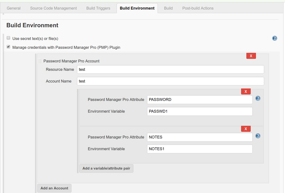 - [変数/属性ペアの追加]をクリックして、同様の方法で必要なすべてのPassword Manager Pro属性を含め、構成を保存します。これで、プラグインを Jenkins で使用できるようになりました。