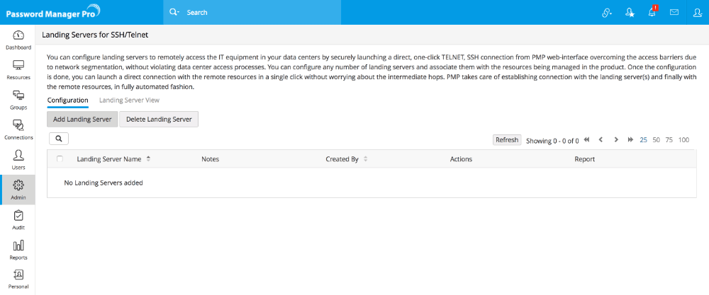 データセンター内の IT 機器にリモートでアクセスするために、任意の数のランディング サーバーを構成できます。ランディング サーバーを製品で管理されているリソースに関連付ける必要があります。構成が完了すると、中間ホップを気にせずに、ワンクリックでリモート リソースとの直接接続を開始できます。Password Manager Pro は、完全に自動化された方法で、ランディング サーバーとの接続、そして最終的にはリモート リソースとの接続の確立を処理します。