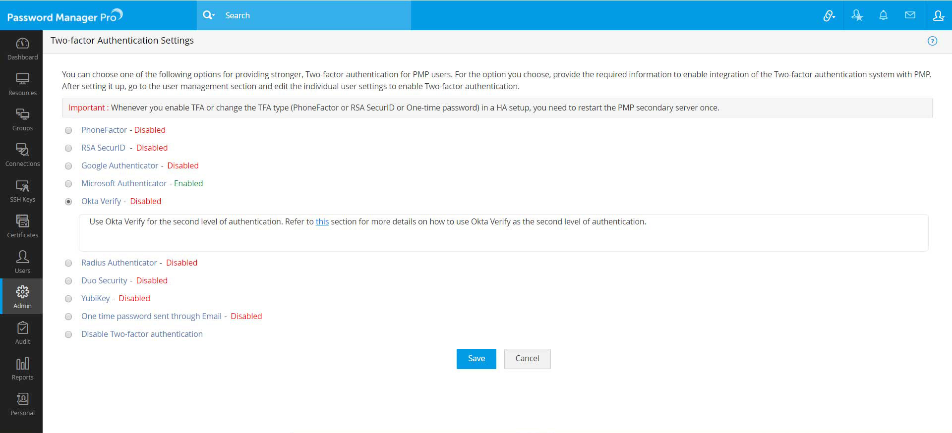 - [Okta Verify] オプションを選択し、[保存] をクリックします。