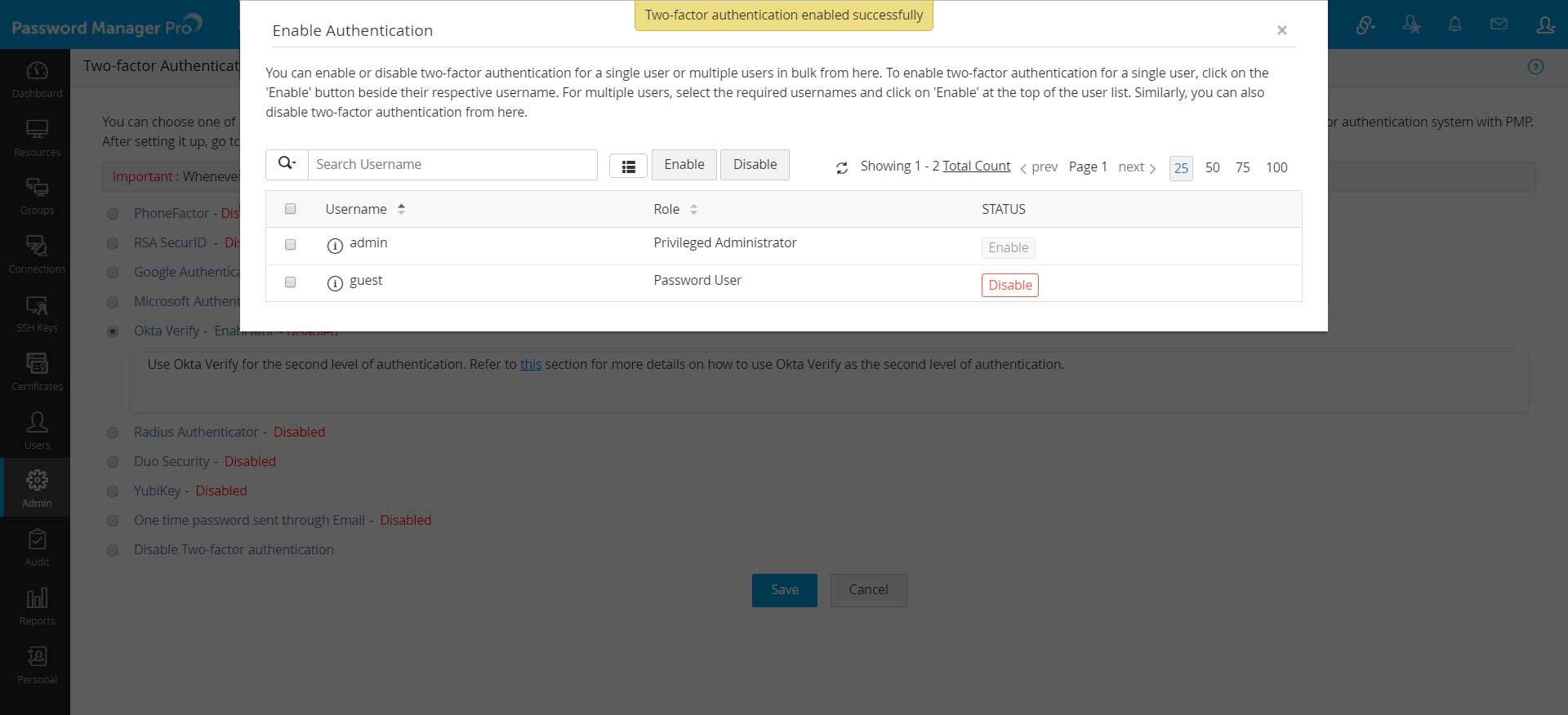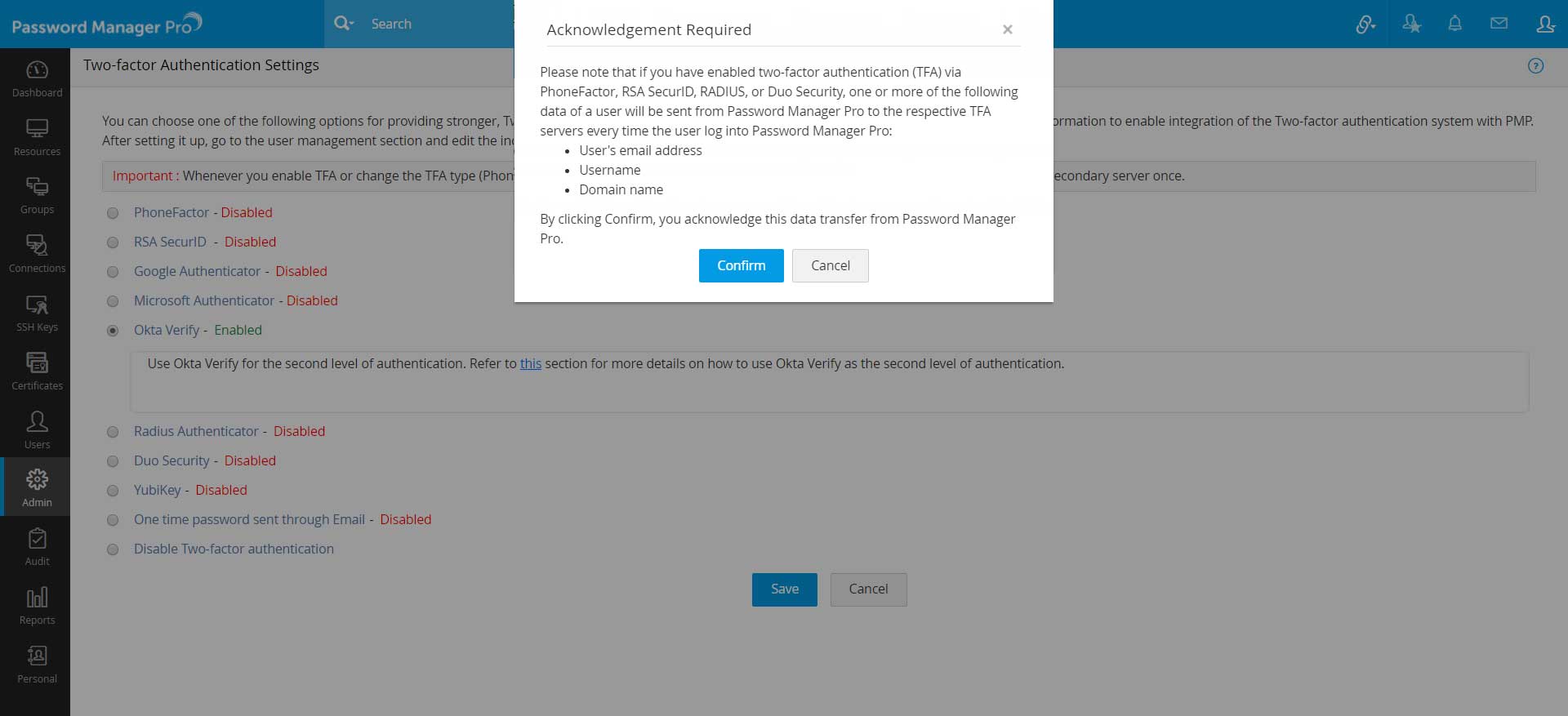 - Password Manager Pro は、Okta Verifyを通じて2段階目の認証情報を要求します。